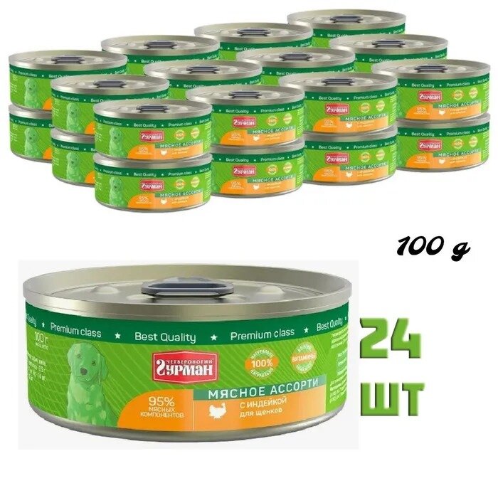 На сегодняшний день товар «Влажный корм Четвероногий гурман Мясное ассорти для щенков индейка 100г (103101015)» можно купить с кешбеком в 1 магазине: Яндекс.Маркет