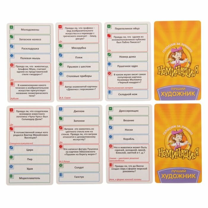 Настольная игра "Номинация: Лучший художник" от Playland подойдет как для детей, так и для взрослых. В наборе представлены 56 карточек с заданиями, 54 жетона для голосования, кубик и урна для голосования. В игре могут участвовать 4 человека. Карточки содержат задания на тему "Изобразительное искусство". Победителем считается игрок, набравший больше всего голосов. Игра подойдет для проведения семейного досуга и отдыха.