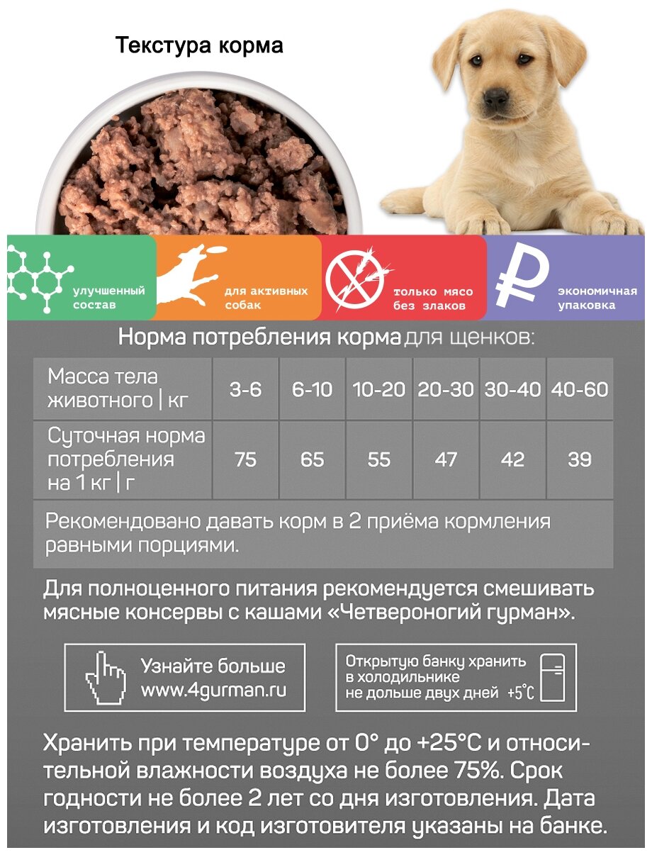 Мясной рацион Четвероногий гурман - корм премиум класса, в составе которого 95% мясных компонентов.Укрупненная степень измельчения, высокобелковый состав и большая банка делают корма отличным выбором для кормления активных собак крупных пород. Мясной рацион отлично сочетается с моментальными кашами Четвероногий гурман.Норма кормления: 70 - 90 г на 1 кг веса животного. Суточную норму разделить на два приема кормления. Употреблять при комнатной температуре.Объем банки: 850 г