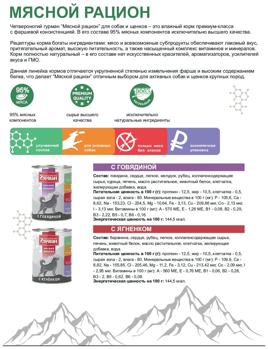 Мясной рацион Четвероногий гурман - корм премиум класса, в составе которого 95% мясных компонентов.Укрупненная степень измельчения, высокобелковый состав и большая банка делают корма отличным выбором для кормления активных собак крупных пород. Мясной рацион отлично сочетается с моментальными кашами Четвероногий гурман.Норма кормления: 70 - 90 г на 1 кг веса животного. Суточную норму разделить на два приема кормления. Употреблять при комнатной температуре.Объем банки: 850 г