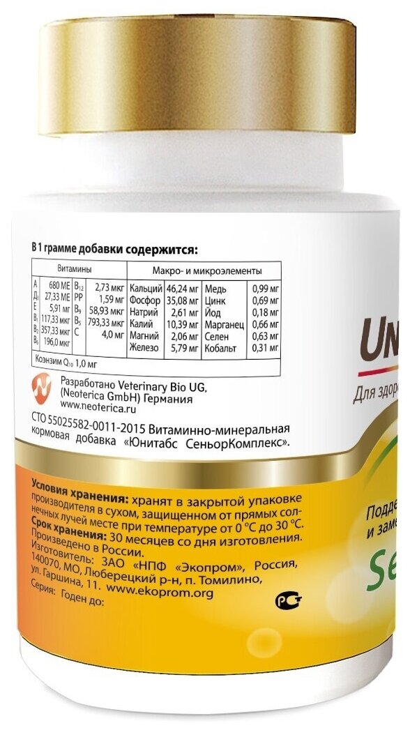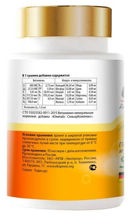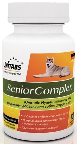 Unitabs – это серия витаминно-минеральных комплексов для собак всех возрастов и пород, которые содержат коэнзим Q10 и все необходимые витамины, макро- и микроэлементы.Формулы витаминно-минеральных комплексов Unitabs разработаны совместно с фирмой Veterinary Bio (Германия) и соответствуют европейскому стандарту качества.SeniorComplex для собак старше 7 лет, 100 таб.Замедляет процесс старения. Поддерживает иммунитет. Нормализует обмен веществ.Юнитабс СеньорКомплекс применяют собакам старше 7 лет для нормализации обмена веществ.Добавку вводят в корм собакам или задают перорально с руки, ежедневно из расчета 1 таблетка на 10 кг массы тела. Курс применения не ограничен.