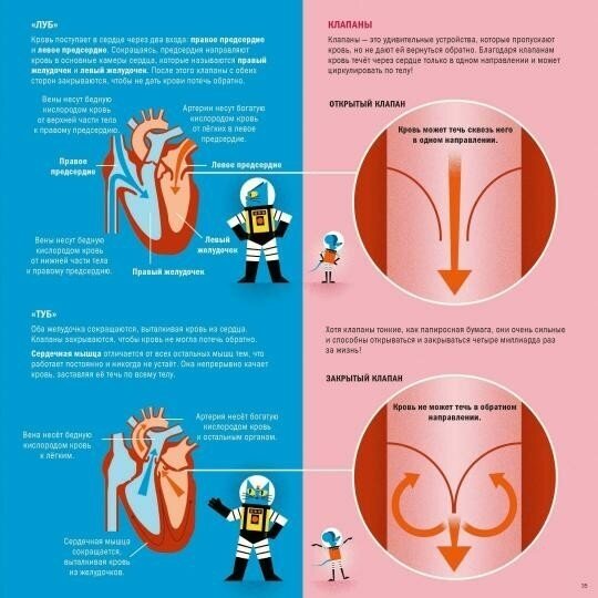 Все три книги дают максимально полезную информацию по рассматриваемой теме, все оформлены в стиле инфографики и напоминают научный комикс, да, по сути, им и являются. Все – огромного размера, позволяющего детально проработать рисунки и изобразить все нужные элементы. Пожалуй, ни в одной другой книге я не видела человеческий глаз, изображенный почти на двух разворотах, с пояснениями и комментариями. Каждый разворот посвящен отдельной теме: легкие, скелет, почки, печень, кровеносная, нервная, лимфотическая системы и др.