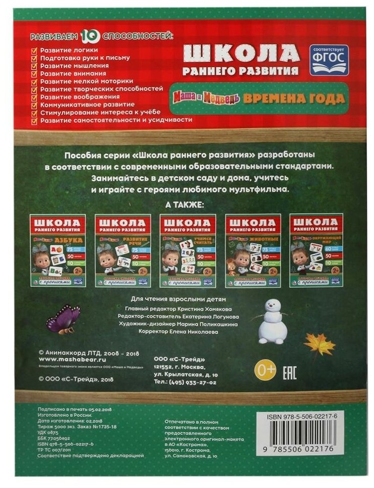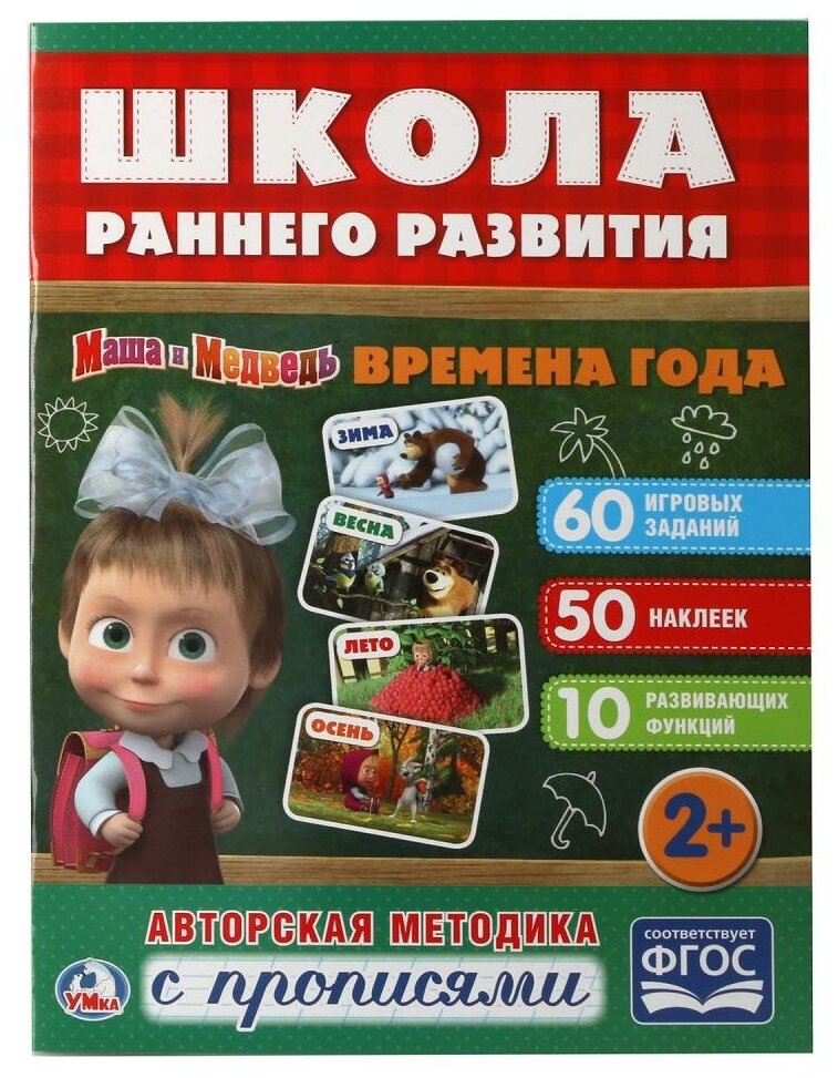 "Школа раннего развития" - новейшая серия пособий по обучению малышей с 2-х лет! Книга с наклейками и прописями "Времена года" содержит 75 игровых заданий, 50 красочных, многоразовых наклеек и 10 развивающих функций по эксклюзивной методике ТМ "Умка". Всё это сделает процесс изучения времён года и их особенностей увлекательным и продуктивным. На страницах ребёнок найдёт изображения любимых героев мультсериала "Маша и Медведь". Простые задания-прописи помогут подготовиться к письму. Пособия серии "Школа раннего развития" разработаны в соответствии со стандартами образования, поэтому станут незаменимыми помощниками при подготовке к школе. Авторская методика развивает мышление, логику, внимание, самостоятельность, усидчивость и интерес к учёбе.