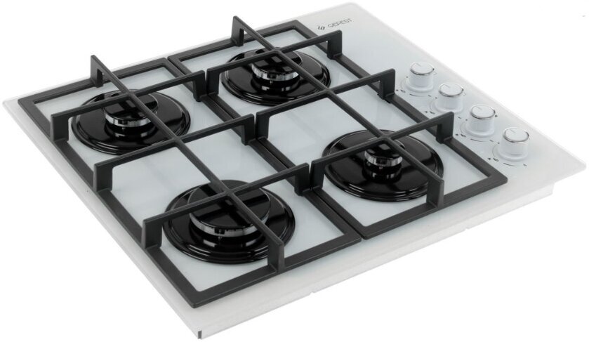 (ВхШхГ) 10х60х52,5см. 4 конфорки. Встроенный электророзжиг. Фиксированное положение «малое пламя». Система «газ-контроль». Варочная поверхность: стеклянная пластина белого цвета, чугунные решетки стола.