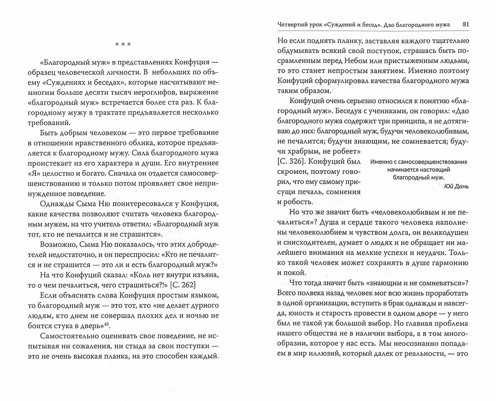 Трактат "Суждения и беседы" ("Лунь юй") был написан учениками Конфуция. Это сборник изречений великого мудреца. Как и любая древняя литература, это произведение достаточно сложно для восприятия. Профессор Юй Дань с детства любила традиционную литературу. Однажды она решила сделать ее ближе современному человеку, поделиться своим восприятием наиболее известного и важного канонического текста. Книгу Юй Дань отличает особая лиричность, связанная с ее детскими воспоминаниями о знакомстве с конфуцианской этикой. Ей удалось постичь эту древнюю мудрость, понять ее актуальность и изложить слова Конфуция простым языком.