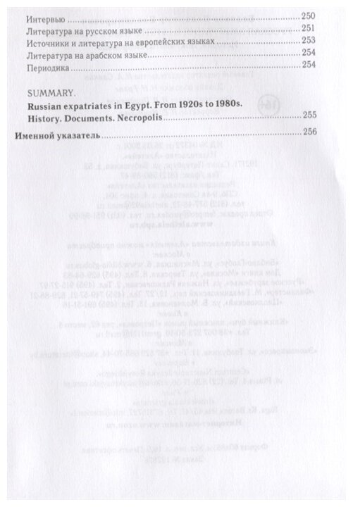 Монография посвящена русской белоэмигрантской общине в Египте. Автор исследует историю формирования, условия жизни, место в египетском обществе и причины исчезновения русской общины. Специальный раздел посвящен видным представителям русской общины и их вкладу в египетскую и русскую культуру. В качестве приложений публикуются большой корпус документов, значительная часть которых вводится в научный оборот впервые, а также описание российского православного некрополя в Египте.