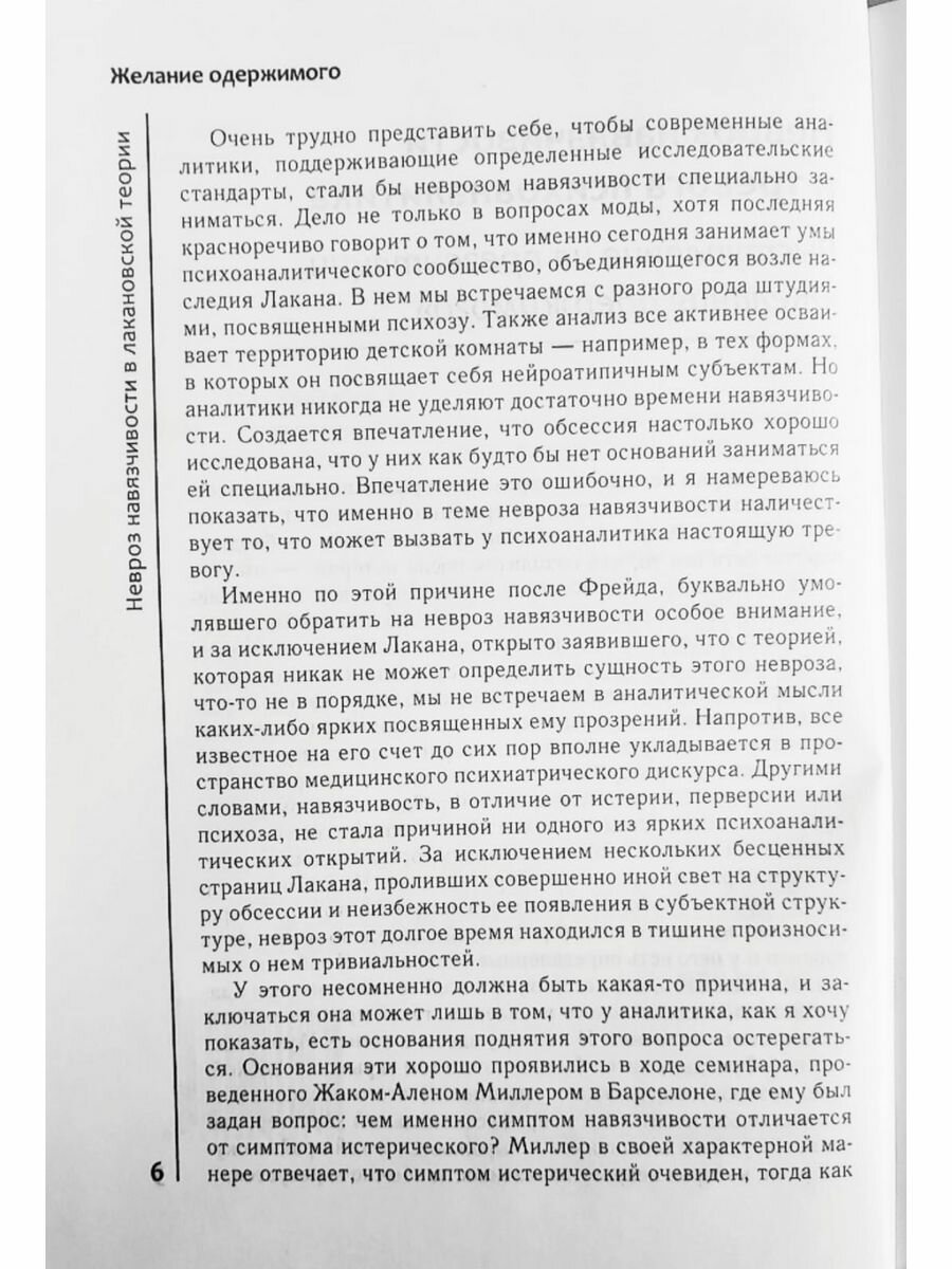 Невроз навязчивости, или так называемое обсессивно-компульсивное расстройство, долгое время вслед за Зигмундом Фрейдом являлось предметом интереса психоаналитиков. Сегодня интерес этот начал угасать, причиной чего является недостаточное осмысление посыла, составляющего существо работы Фрейда в области структур навязчивости. Тексты Жака Лакана, проблематизировавшего фрейдовскую мысль, содержат материал, проработка и развитие которого позволяют вновь вернуть обсессии теоретический потенциал. В работе подчеркивается, что вклад Лакана позволяет изучать и анализировать симптоматику навязчивости не как индивидуальное нарушение, а как структуру, широко обнаруживаемую в психическом устройстве современного субъекта. Книга освещает ряд феноменов душевной жизни субъекта навязчивости - таких как борьба за признание, взаимоотношения со своим симптомом, любовная жизнь и фобические явления.