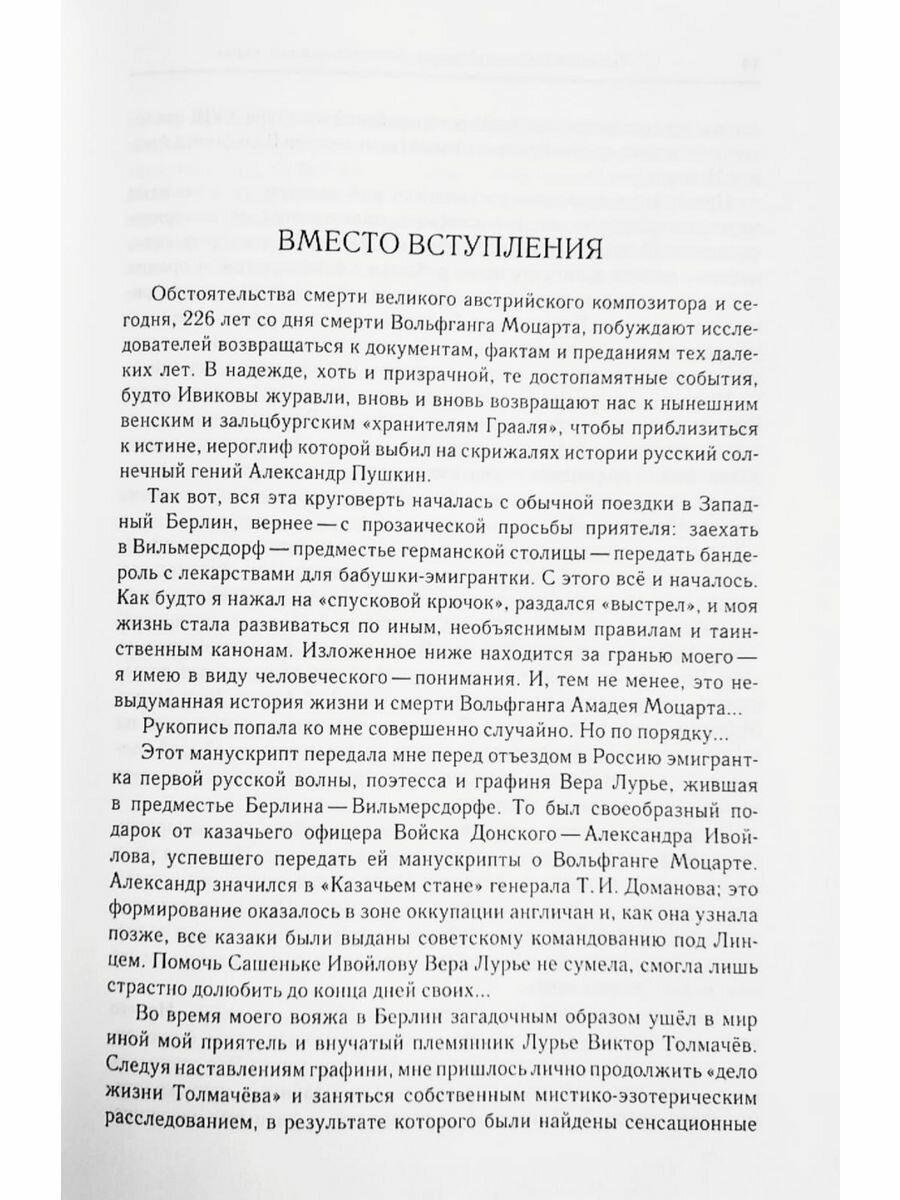 Благодаря использованным в работе документам, артефактам и уникальным научным экспериментам, автор подводит читателя вплотную к раскрытию одной из величайших тайн XVIII века, закодированной в гениальном шедевре А. С. Пушкина «Моцарт и Сальери».