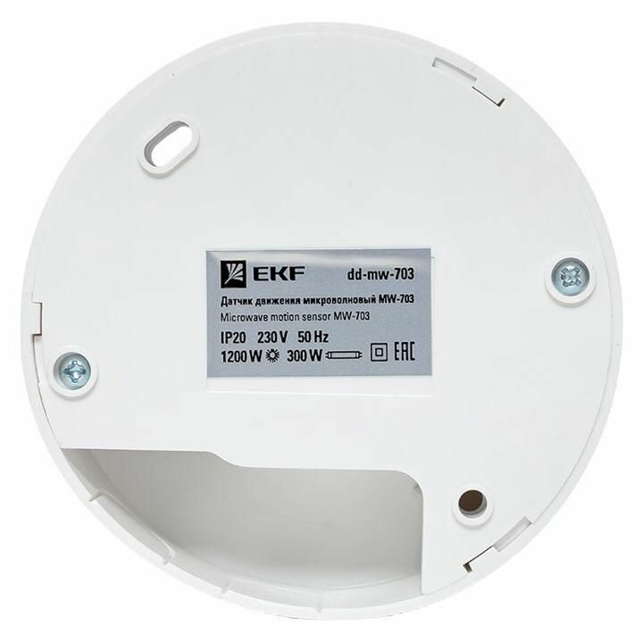 Датчик движения микроволновый MW-703 предназначен для экономии электроэнергии за счет автоматического управления освещением и другими инженерными системами. Датчик реагирует на движение людей и других объектов в зоне действия сенсора, принцип работы датчика основан на генерировании высокочастотных электромагнитных волн и детектировании полученного эха. Таким образом микроволновые датчики имеют повышенную чувствительность и могут детектировать движение сквозь тонкие преграды (гипсокартон, стекло, подвесной потолок и т.д.). Датчик MW-703 предназначен для накладного монтажа на потолок. Рекомендуется использовать датчик в кладовках, гардеробных и других помещениях с временным пребыванием людей. Алгоритм работы: при возникновении движения в поле зрения датчика встроенное электромеханическое реле (рассчитано на полную мощность 1200Вт) коммутирует подключенную нагрузку. После этого нагрузка находится под напряжением в течение заданного времени (от 10 сек. до 15 минут, время настраивается) и выключается. ПРЕИМУЩЕСТВА. Схема подключения указана на корпусе изделия. Удобная регулировка параметров работы изделия. Безвинтовые клеммы подключения проводов. Герметичные вводы для провода. Светодиодные индикаторы параметров работы изделий. Ультракомпактные размеры некоторых моделей. Экономия электроэнергии в зависимости от уровня освещенности. Автоматическое управление освещением и бытовыми приборами. Городская и частная осветительная сеть. Жилой сектор. Различные объекты строительства и инфраструктуры.