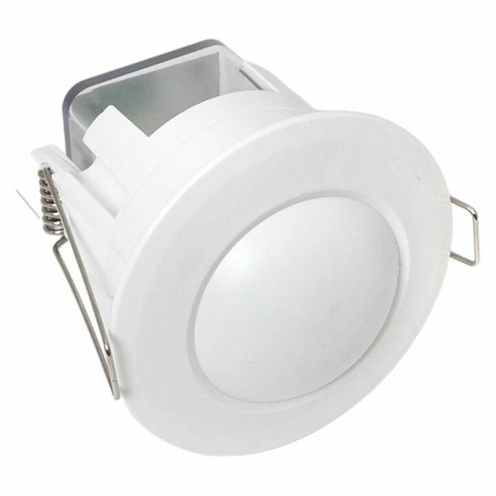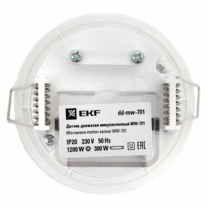 Микроволновые датчики движения MW автоматически управляют освещением и другими инженерными системами. Датчики генерируют высокочастотные электромагнитные волны и реагируют на получаемое эхо. Благодаря повышенной чувствительности датчики могут фиксировать движение через преграды: в раздевалках, коридорах, промышленных линиях или складских помещениях. В ассортименте есть 4 разновидности оборудования: настенные, потолочные, накладные и встраиваемые датчики. На корпусе изделия расположены регуляторы времени задержки и уровня освещённости. Датчик не срабатывает, если уровень освещённости будет выше установленного вами, что позволяет экономить электричество в дневное время. Схема подключения изображена на корпусе изделия. Микроволновый датчик движения бел. 1200Вт 360гр. до 20м IP20 MW-701 EKF PROxima Микроволновый датчик движения MW-701предназначен для установки в натяжной или гипсокартоновый потолок. При фиксации движения электромеханическое реле датчика движения коммутирует подключенную нагрузку и автоматически выключается, если движение прекращается. Рекомендуется использовать датчик в коридорах, гардеробных, подсобных помещениях и других зонах с временным пребыванием людей. соответствуют ГОСТ Р 51324.1-2012 (МЭК 60669-1-2007) и ГОСТ Р 51324.2.1-2012 (МЭК 60669-2-1:2009); регулировка угла наклона и направления датчика; детектируемая скорость объекта — 0,6-1,5 м/с; номинальное напряжение — 230 В; номинальная частота — 50 Гц; регулируемый диапазон срабатывания по освещённости — 3–2000 лк; потребляемая мощность — 0,1 – 0,45 Вт; высота установки — 1,5 – 3,5 м; регулируемое время отключения — 10 с – 15 мин; максимальная мощность нагрузки (для ламп накаливания /светодиодных) — 1200/300 Вт; угол обзора — 360°; максимальный радиус зоны детектирования на уровне пола — 10 м;