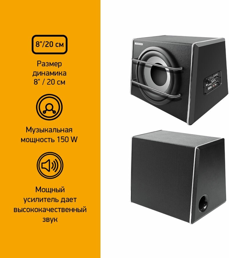 Качество звука небольшой встроенной акустической системы в автомобиле может не всегда устроить автовладельца. Автомобильный сабвуфер Digma , отвечающий за воспроизведение низких звуковых частот, гарантирует объемное звучание с глубокими басами. Активный сабвуфер Digma оборудован собственным усилителем. Устройство уверенно отрабатывает до 150 Вт мощности.