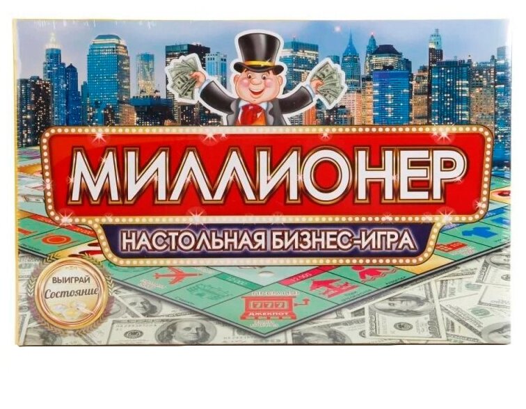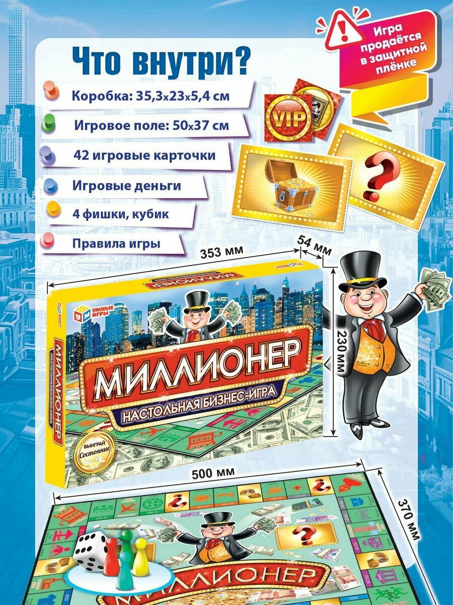Настольная игра «Миллионер» предназначена для знакомства детей с товарно-денежными отношениями, улучшения навыков счёта и развития сообразительности. Задача игроков - перемещаясь по игровому полю скупать объекты, которые смогут принести дивиденды. Выигрывает тот участник, который окажется к финалу игры самым богатым. Игра представлена красочно исполненным игровым полем, фишками, карточками, жетонами, игровыми деньгами и кубиками для определения количества ходов. Игроки поочерёдно бросают кубик и, совершая определённое количество ходов, выполняют задание, которое им выпадает. Задача каждого игрока заработать деньги и увеличить свои капитал. Для увеличения капитала игроки могут приобретать различные предприятия: банки, кинотеатры, супермаркеты, которые смогут принести им доход. Выигрывает участник, который окажется на финише самым богатым миллионером. Изделие сертифицировано и изготовлено из качественных материалов. В наборе: карточки, жетоны, игровые деньги, игровое поле, фишки, 2 игральных кубика, инструкция. Количество предполагаемых игроков: 2-6. Состав: картон, пластик.
