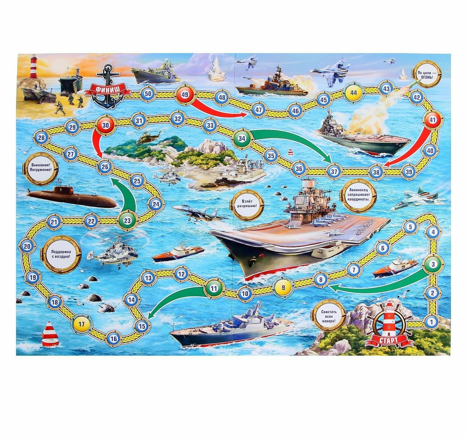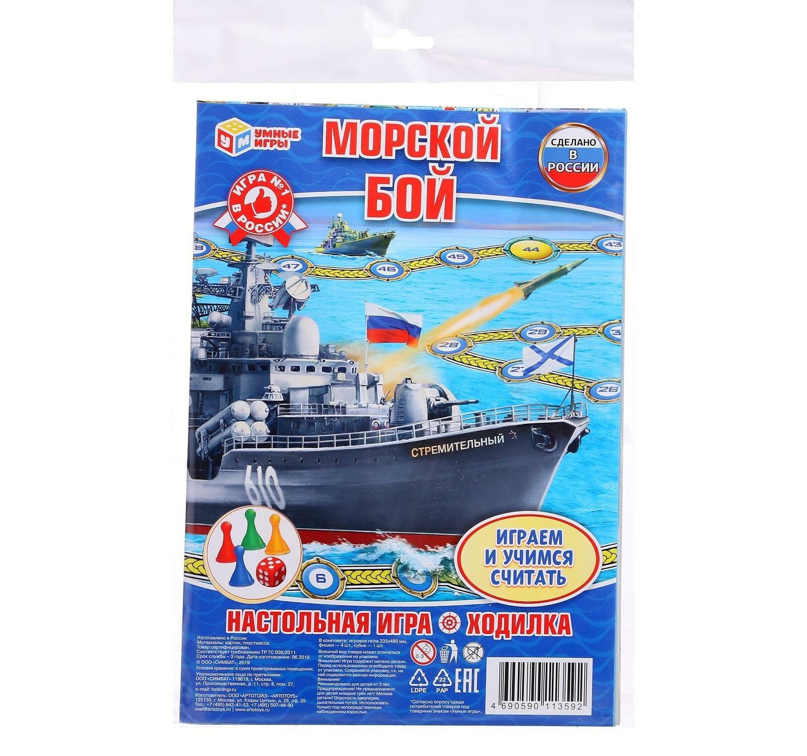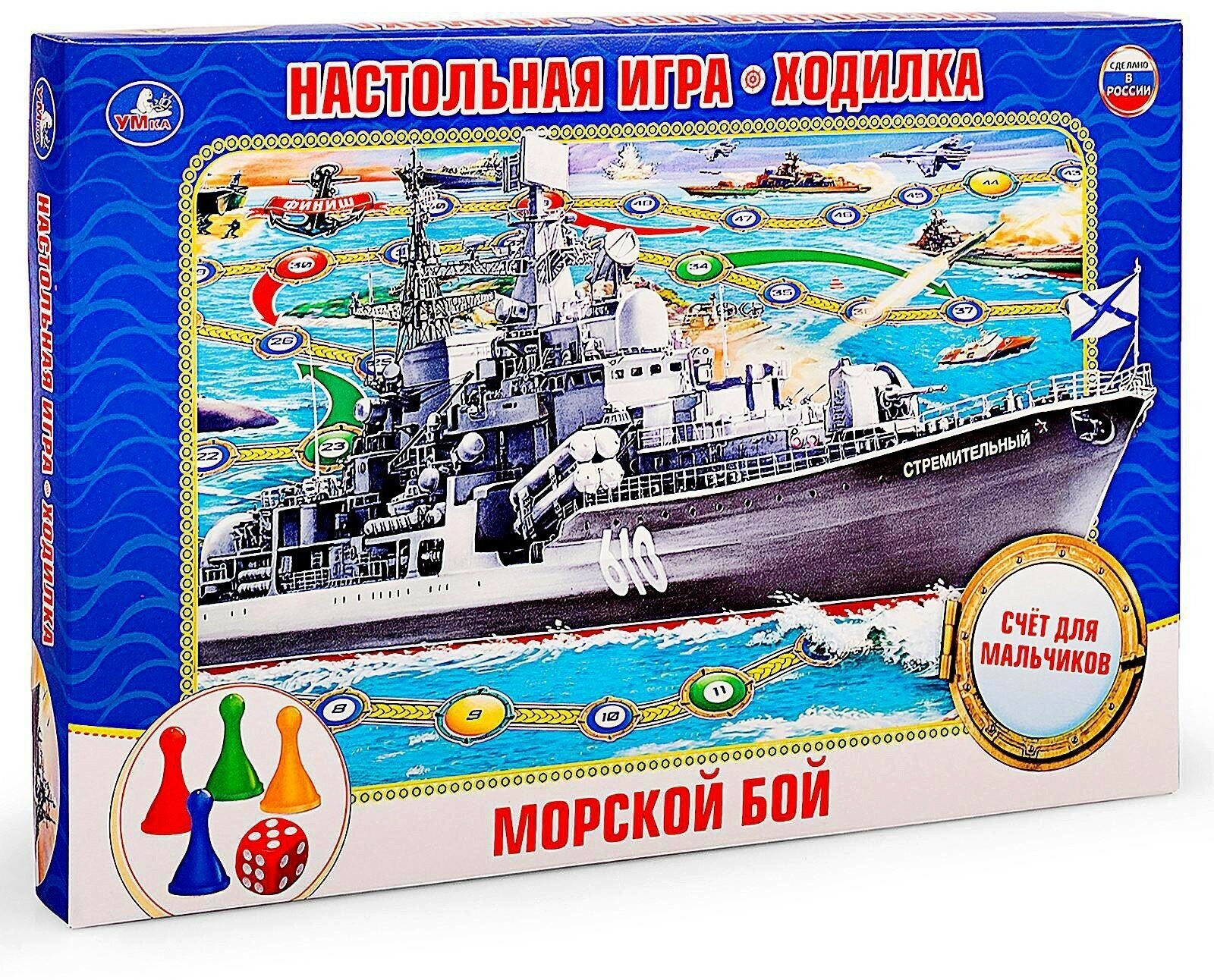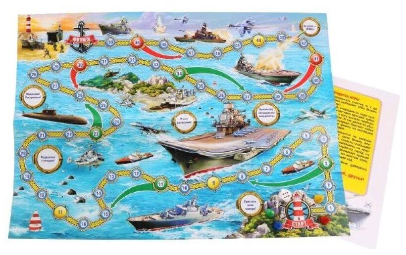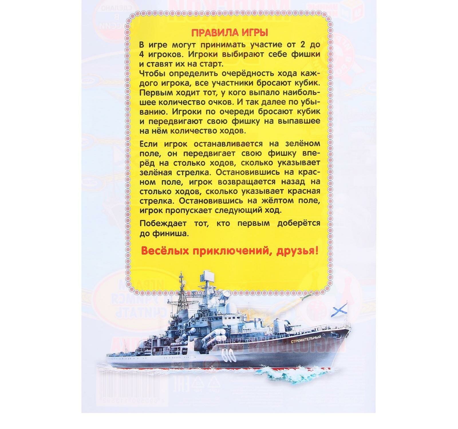 В настольной игре очень важен не только выигрыш, но и проигрыш, ведь в раннем возрасте крохе надо объяснить, что не всегда получается так, как хочет он. Тем более в процессе этого развлечения все зависит лишь от удачи и того количества, которое выпадет на кубике. Игра выполнена в морском стиле с изображениями кораблей. В игре могут принять участие от 1 до 4 детей. В процессе игры дети смогут научиться считать, совершая свой ход. Набор изготовлен из высококачественного пластика и плотного картона, которые абсолютно безопасны для детей и сертифицированы. Фишки и игровое поле окрашены яркими нетоксичными красителями, устойчивыми к истиранию и выгоранию. Игра продаётся в блистере, в малом формате, потому её удобно брать с собой. Материал: пластик, картон.