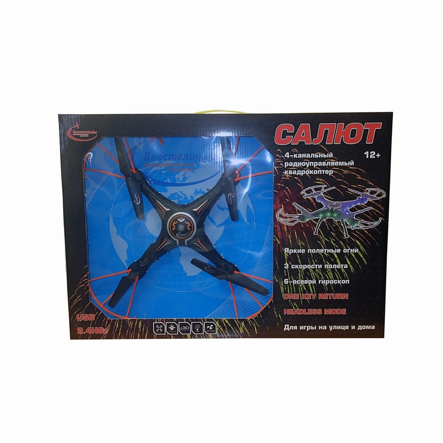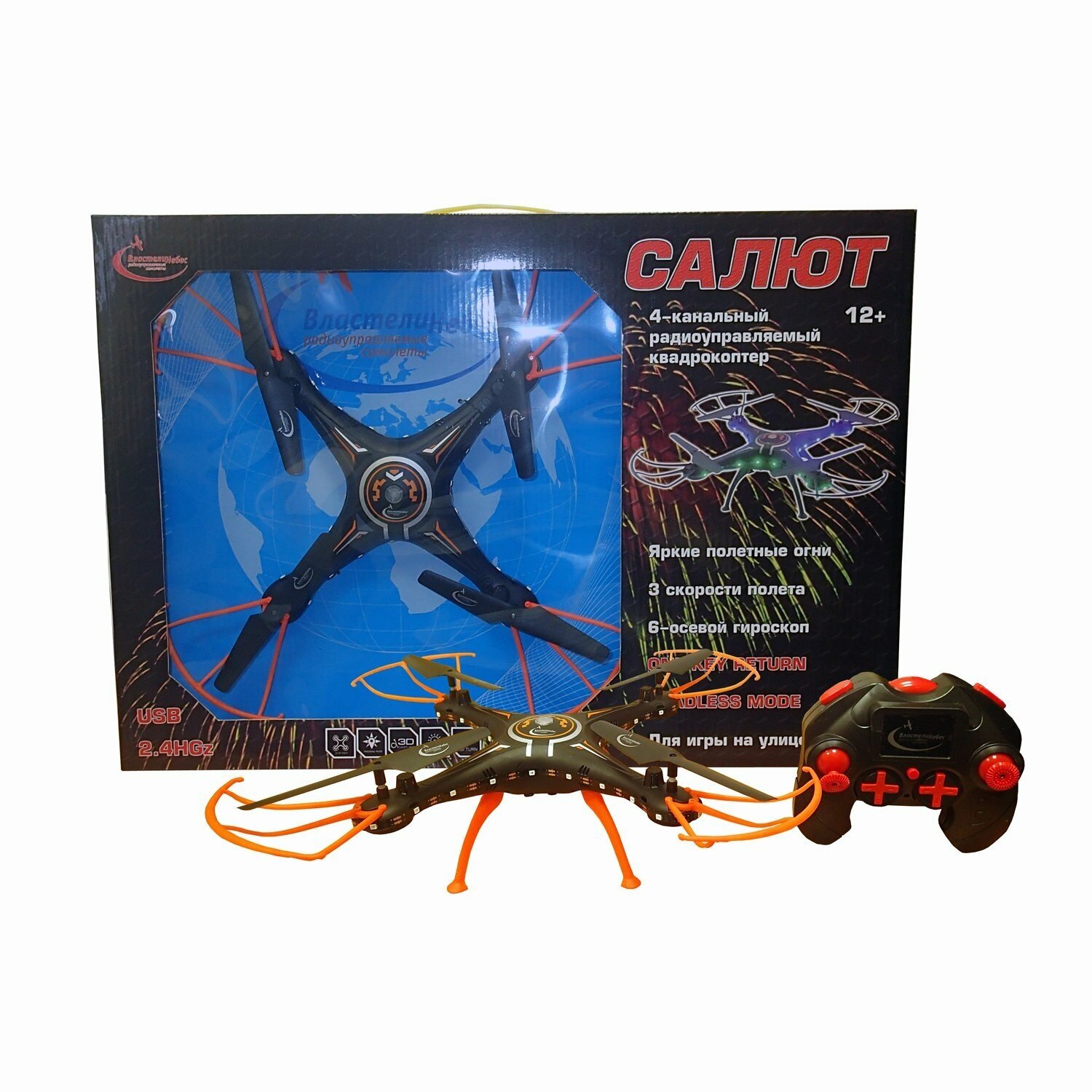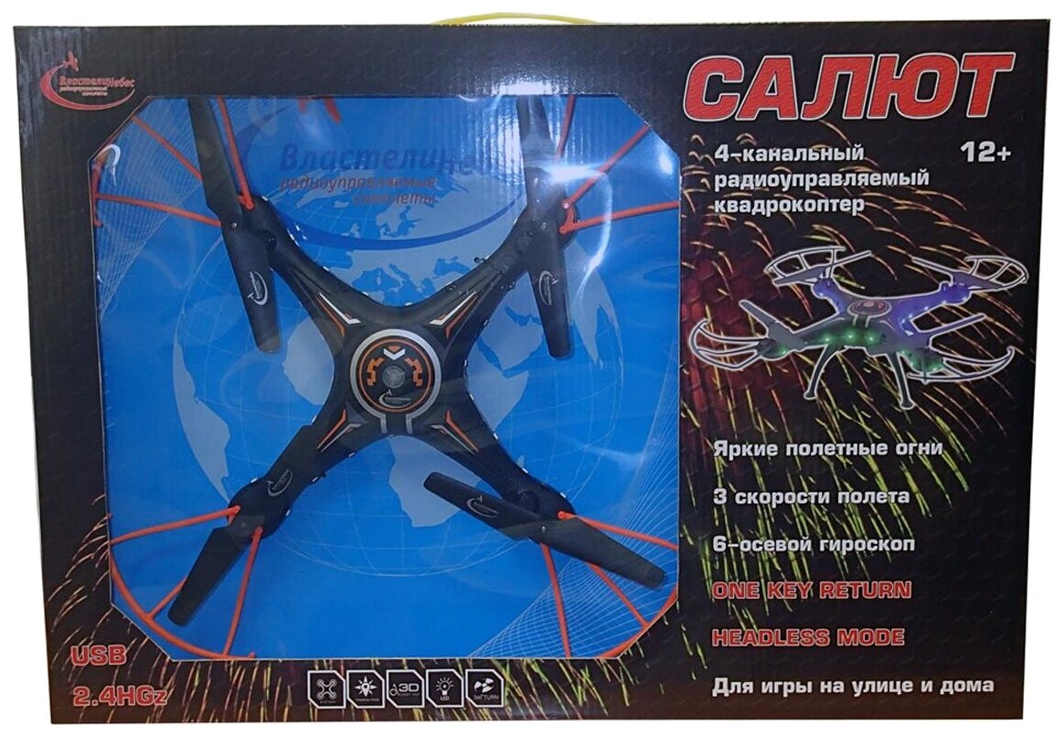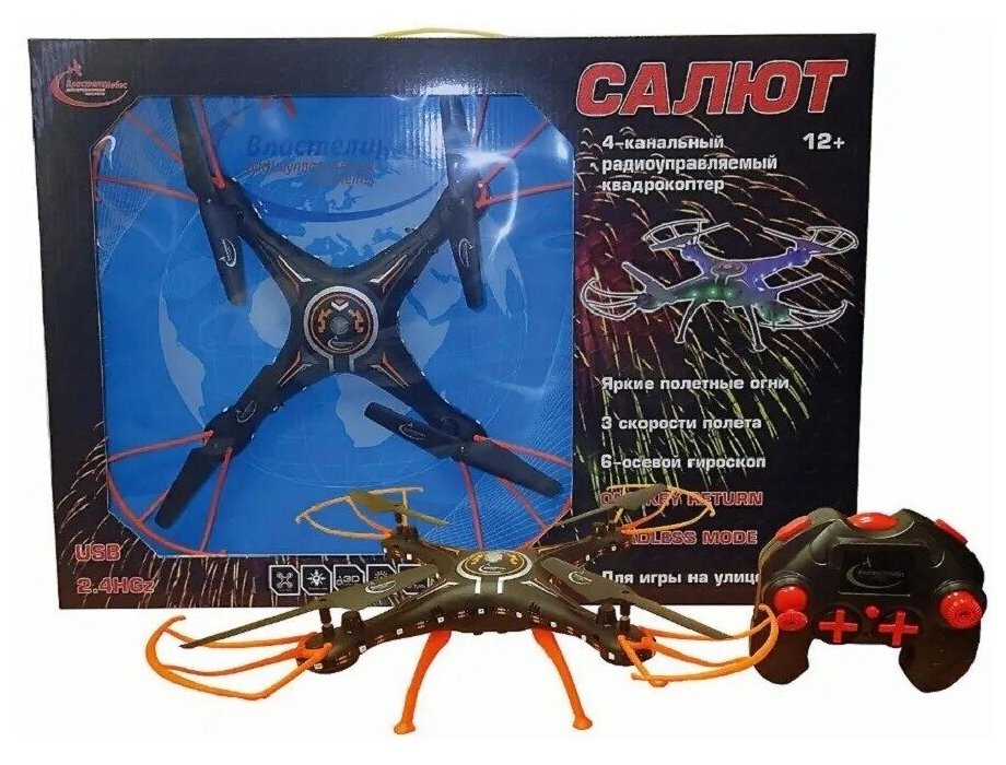 Радиоуправляемый квадрокоптер Властелин небес Салют – отличный подарок для детей и взрослых. Современная модель квадрокоптера обладает обширным функционалом, оснащена шестиосевым гироскопом, который служит для стабилизации полета. Игрушкой так легко управлять даже новичку. Квадрокоптер отличается стильным дизайном, выполненным в черно-оранжевых тонах и изготовлен из прочных материалов с надежной защитой винтов. Игрушка способна выполнять как стандартные повороты влево-вправо, двигаться вперед-назад, так и головокружительные трюки - сальто на 360 градусов в любую сторону. Есть также функция автоориентации и возвращения к месту старта. Квадрокоптер оснащен световыми эффектами, что делает игру еще более увлекательной. Игрушка развивает многочисленные способности ребенка - мелкую моторику, пространственное мышление, реакцию и логику.