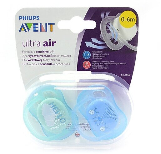 Пустышка Philips Avent ultra air позволяет коже ребенка дышать. 4 увеличенных отверстия и легкий нагубник превосходно пропускают воздух, предотвращая раздражение от конденсата на коже. Легкая пустышка с дышащей текстурой для нежной кожи Пустышка Ultra Air превосходно пропускает воздух, позволяя чувствительной коже малыша дышать. Кожа остается сухой, без раздражения Благодаря особой конструкции пустышки коже малыша поступает больше воздуха, кожа дышит, оставаясь сухой, без раздражения.