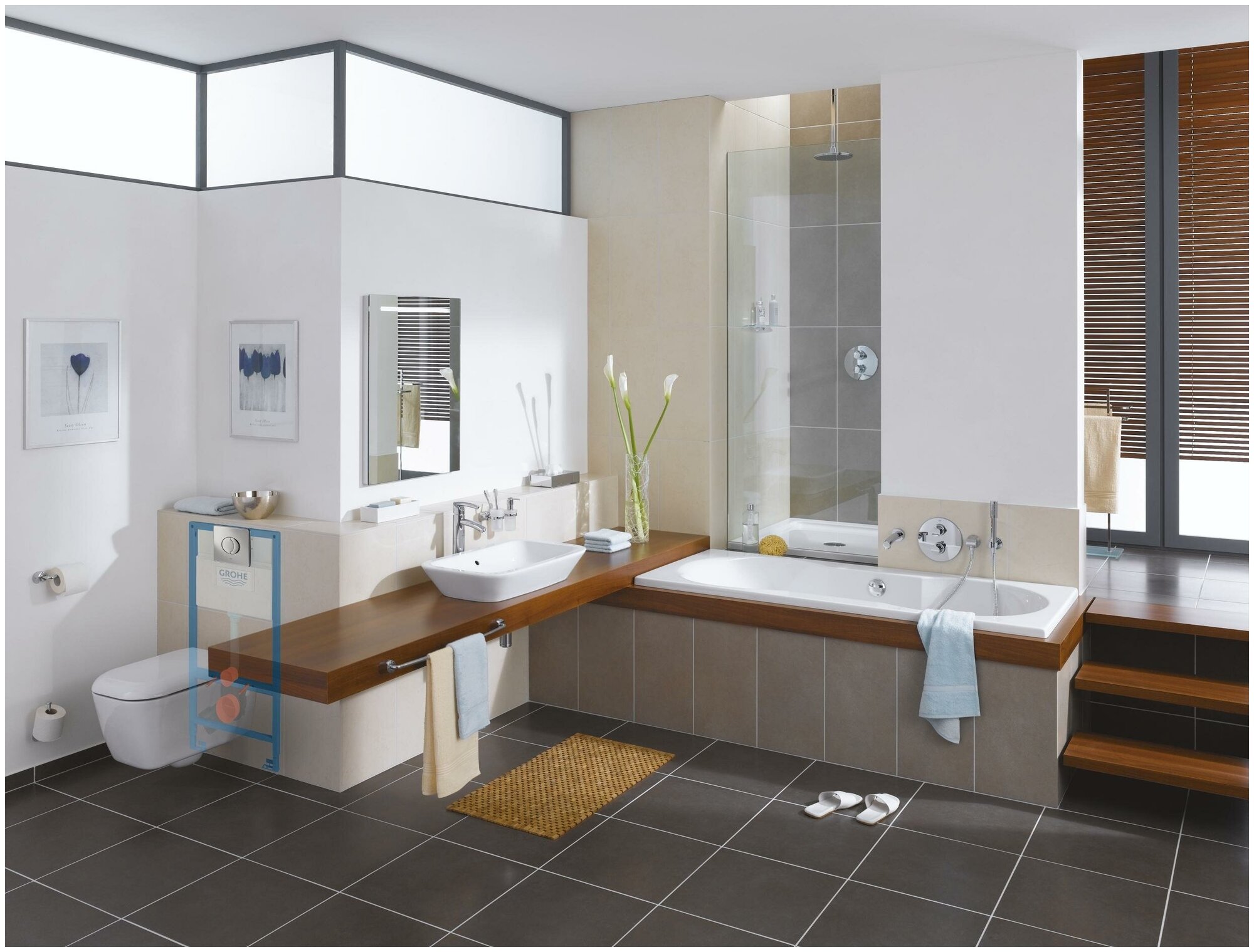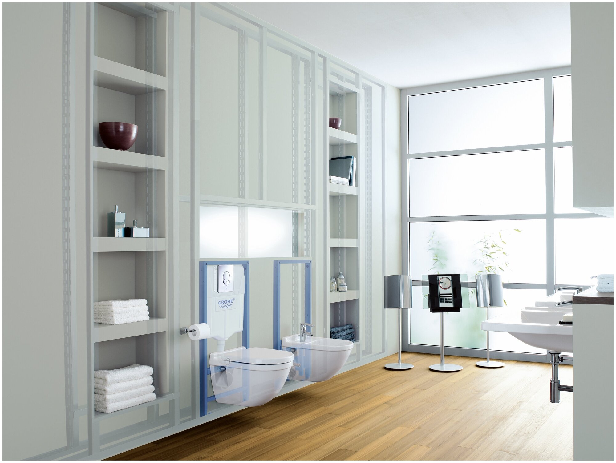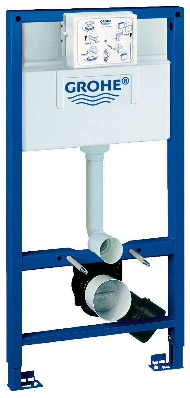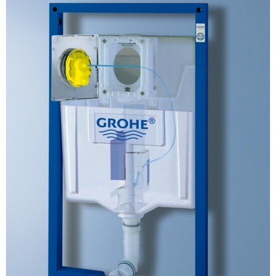 Инсталляция для унитаза Grohe . Рама представляет собой самонесущую стальную конструкцию с порошковым напылением, которая подготовлена для облицовки и имеет двойной слив: большой на 9 литров, а малый на 6 литров. Инсталляция используется для монтажа перед стеной или стеновой перегородкой. Монтажная рама регулируется по высоте подключения. В комплект входит: держатели для унитаза (болты с креплением для керамики), Крепления к стене заказываются отдельно.