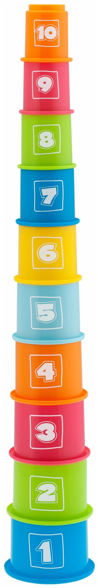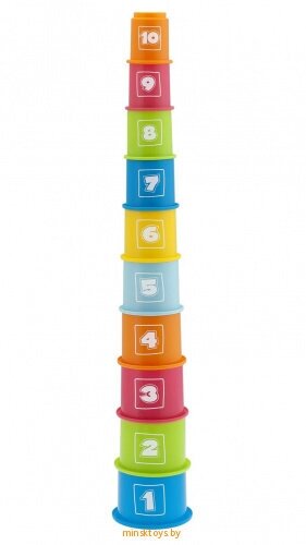 Строй пирамидку и учись считать! В комплект входят 10 стаканчиков различного размера и цвета, на каждом из которых изображены цифры. Постройте пирамидку вместе с малышом, начиная с самого большого компонента, и поместите на верхушку башни самый маленький стаканчик. Пирамидка способствует развитию логического и ассоциативного мышления. Несколько режимов игры: Построй башню и научись считать от 1 до 10. Сложи стаканчики друг в друга. Высота башни: 63,5 см. Возраст: с 9 месяцев.