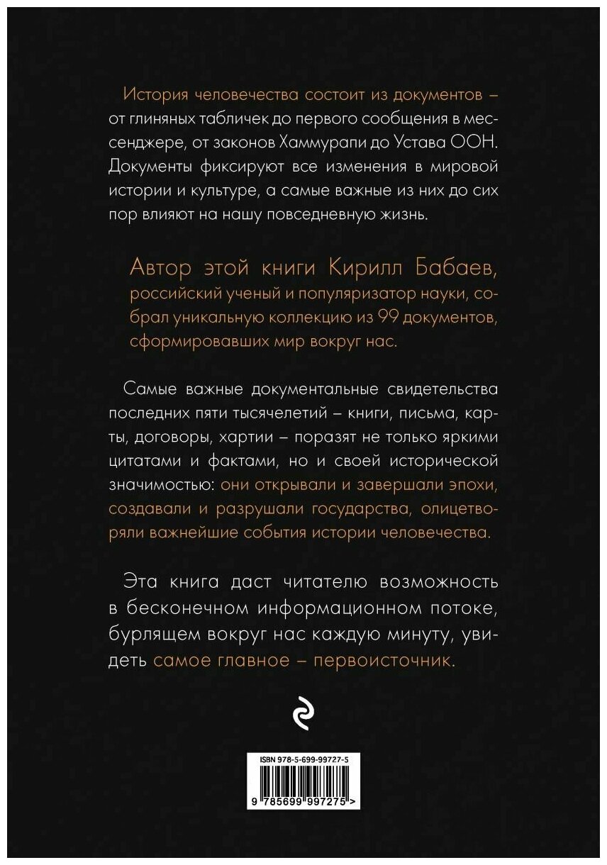 Автор этой книги - Кирилл Бабаев, российский ученый и популяризатор науки, собрал уникальную коллекцию из 99 документов. Это важнейшие письма, договоры, книги, карты и другие документальные свидетельства нашей истории от 3200 года до н. э. до 2017 года. Они открывали и завершали эпохи, олицетворяли важнейшие события в истории, формируя мир вокруг нас. Эта книга даст читателям возможность взглянуть на мировую историю с новой точки зрения и самим оценить важность того или иного документа.