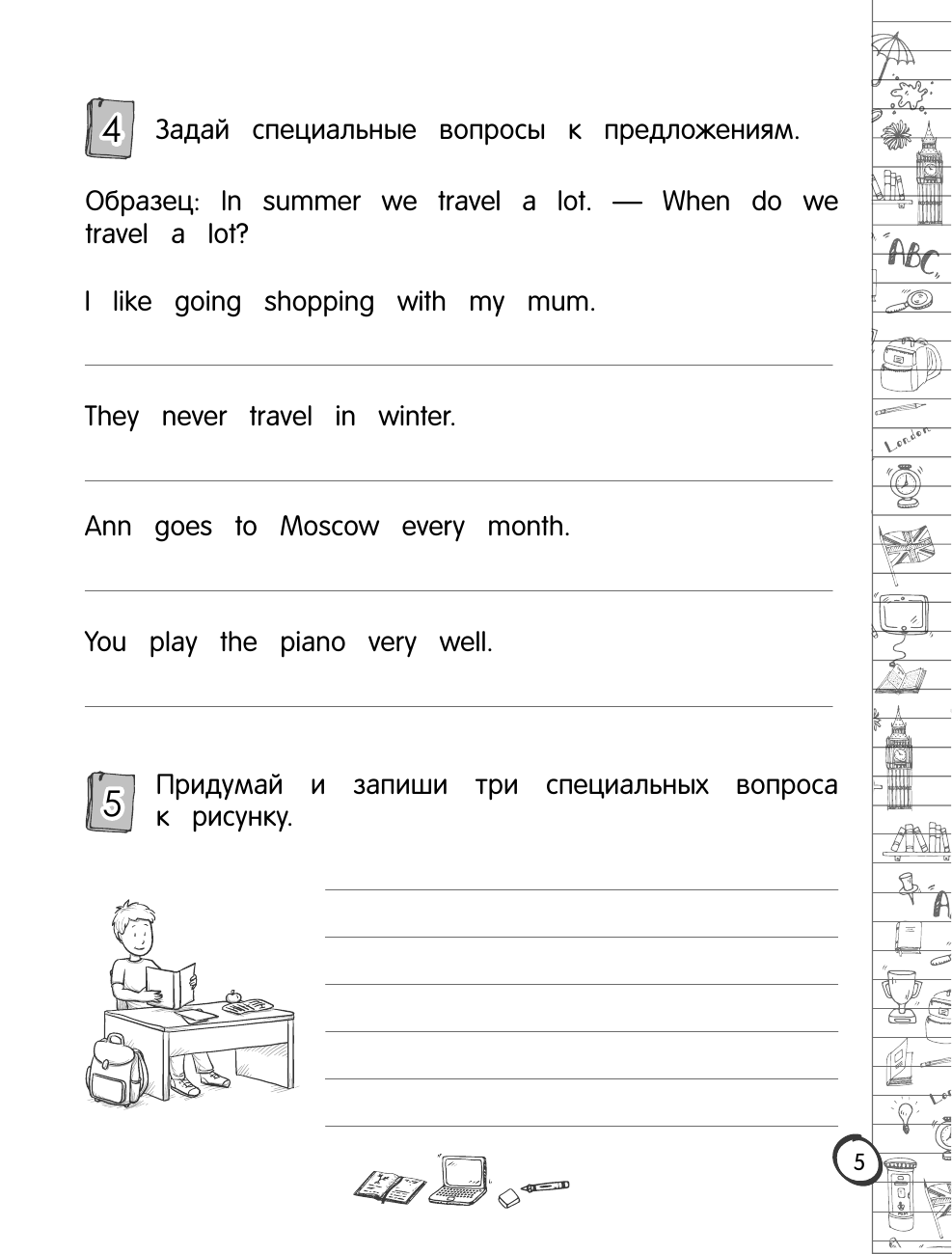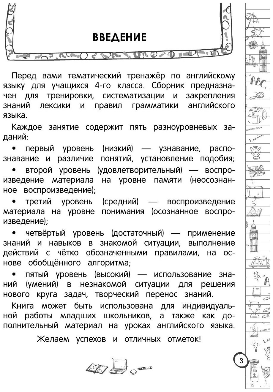 Пособие, соответствующее ФГОС, предназначено для тренировки, систематизации и закрепления знаний и правил английского языка. Каждое занятие содержит 5 разноуровневых заданий: 1-й уровень (низкий) - узнавание, распознавание и различие понятий, 2-й уровень (удовлетворительный) - воспроизведение материала на уровне памяти, 3-й уровень (средний) - воспроизведение материала на уровне понимания, 4-й уровень (достаточный) - применение знаний и навыков в знакомой ситуации, 5-й уровень (высокий) - применение знаний и навыков в незнакомой ситуации.