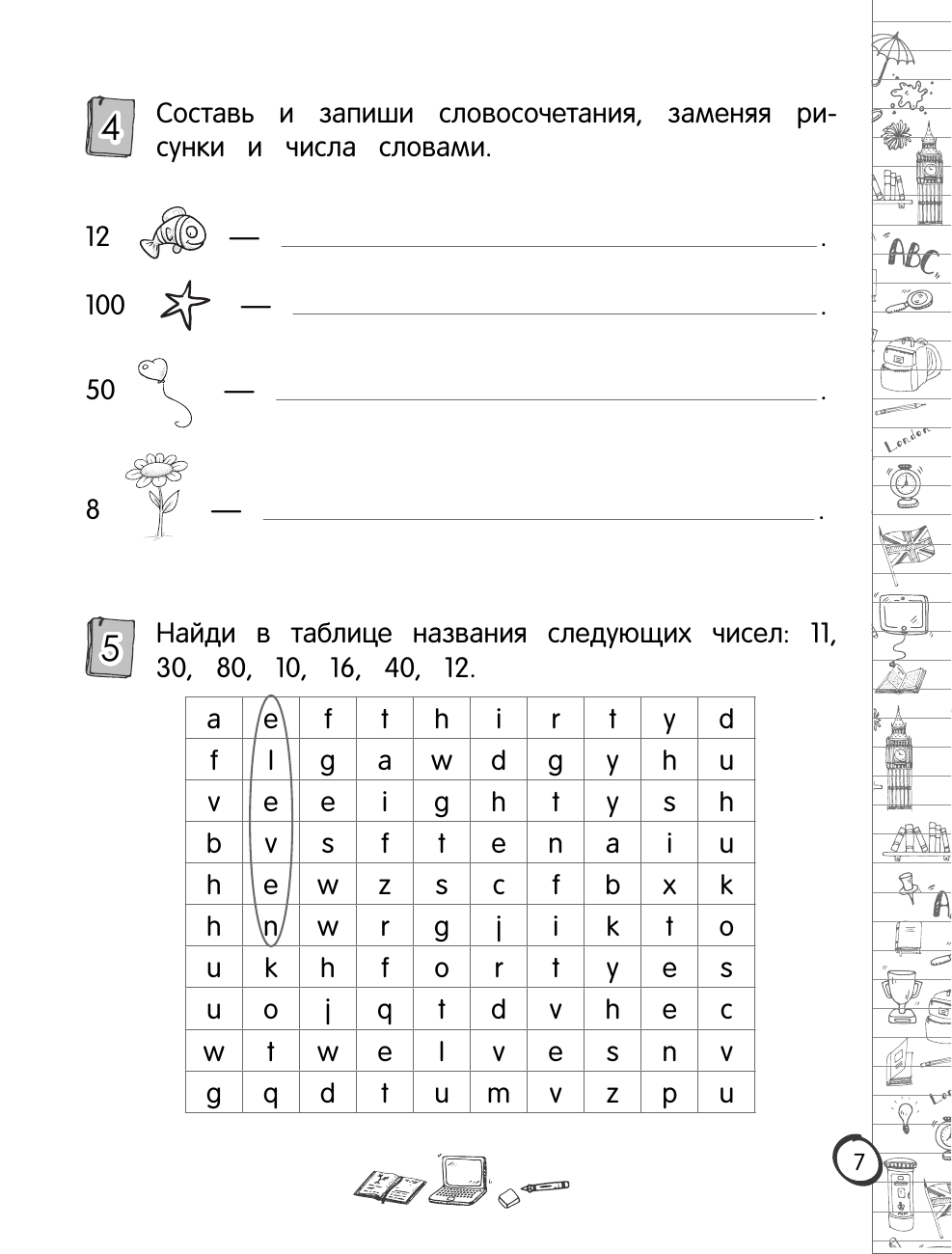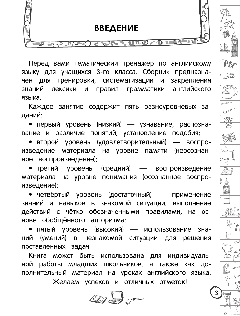 Пособие, соответствующее ФГОС, предназначено для тренировки, систематизации и закрепления знаний и правил английского языка. Каждое занятие содержит 5 разноуровневых заданий: 1-й уровень (низкий) - узнавание, распознавание и различие понятий, 2-й уровень (удовлетворительный) - воспроизведение материала на уровне памяти, 3-й уровень (средний) - воспроизведение материала на уровне понимания, 4-й уровень (достаточный) - применение знаний и навыков в знакомой ситуации, 5-й уровень (высокий) - применение знаний и навыков в незнакомой ситуации. Выполняя задания, ребёнок разовьёт речь и мышление, внимание и память.