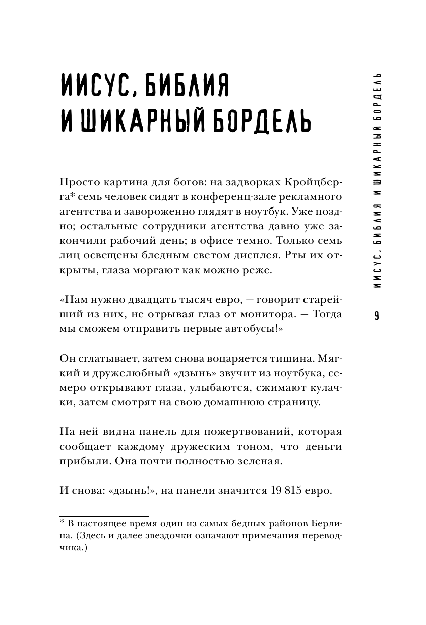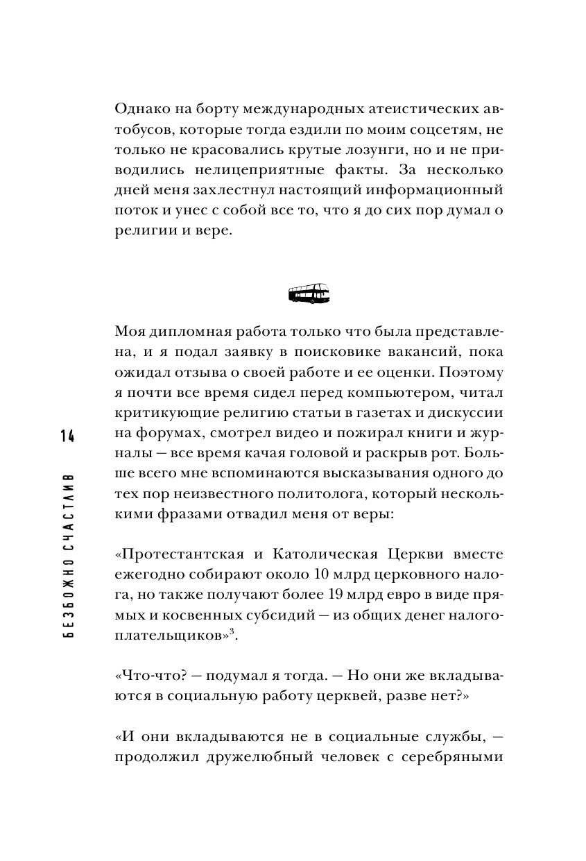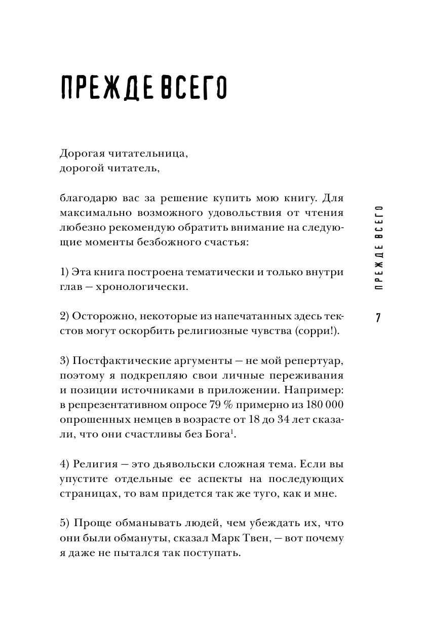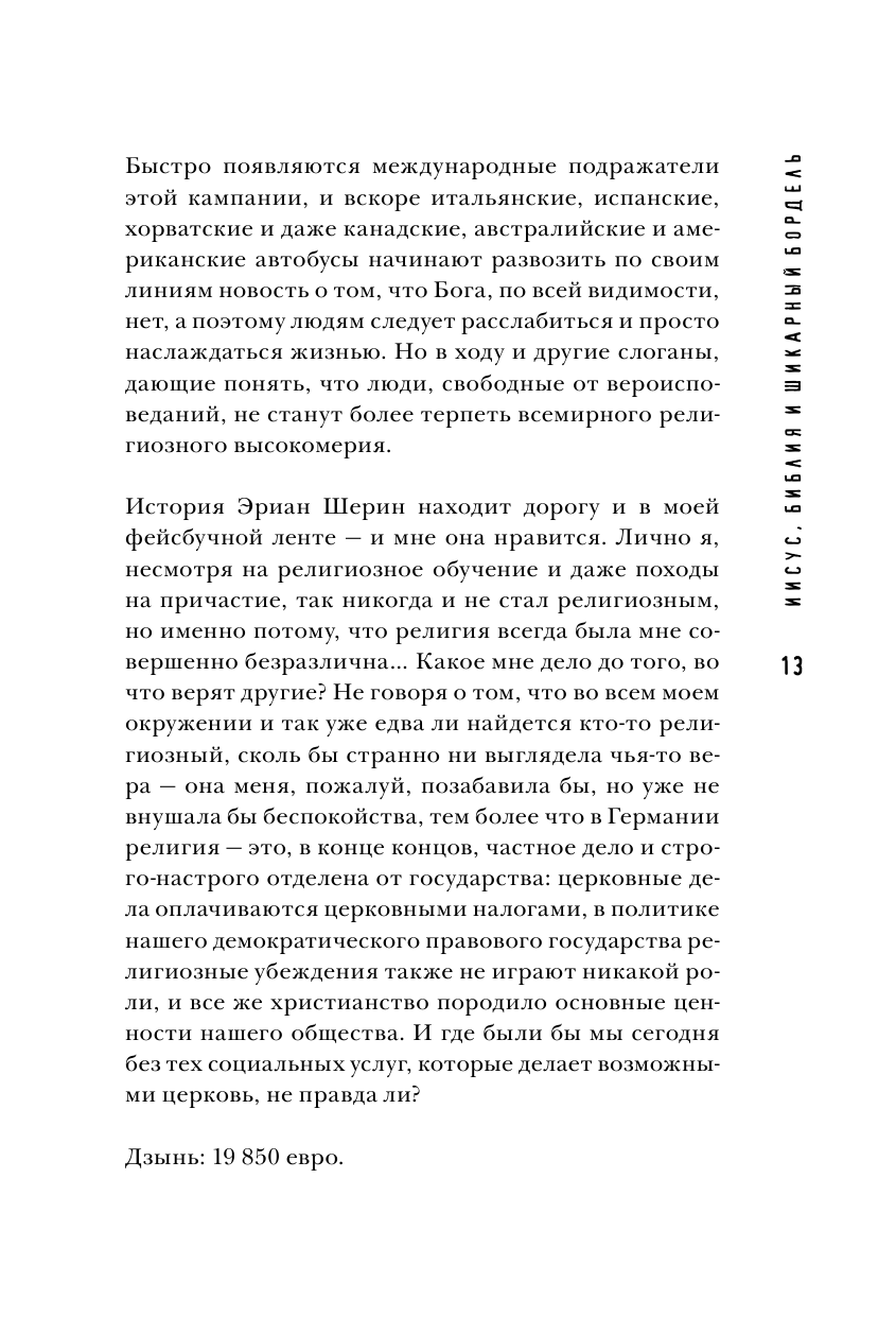 Оригинальное введение в проблематику настоящей роли религии в современном светском обществе на примере Германии. Автор этой книги, молодой школьный учитель математики, не пошел на поводу у церковных пастырей и озабоченных общественной моралью чиновников и политиков, а решил разобраться лично, почему сегодня так много говорят о религии. Сможет ли здравый смысл одержать победу над пропагандой? Какая же она, духовная скрепа по-немецки? Сколько на самом деле верующих? Почему клерикальные функционеры делают из атеизма страшилку? Кто и почему платит церковный налог? На что церковь тратит полученные от государства деньги? Что и зачем рассказывают детям на уроках религии в школах? Как же низко пали аморальные атеисты? О чем на самом деле заботятся противники абортов и эвтаназии? Безбашенный юмор здесь чередуется с горькой иронией, радость ярких мгновений разбавлена трагедиями. И как будто бы религия должна помочь во всем разобраться, выработать правильный взгляд на вещи, преодолеть все невзгоды и сделать лучше мир, но вдруг автор прав, и без религии нам жилось бы легче и лучше?