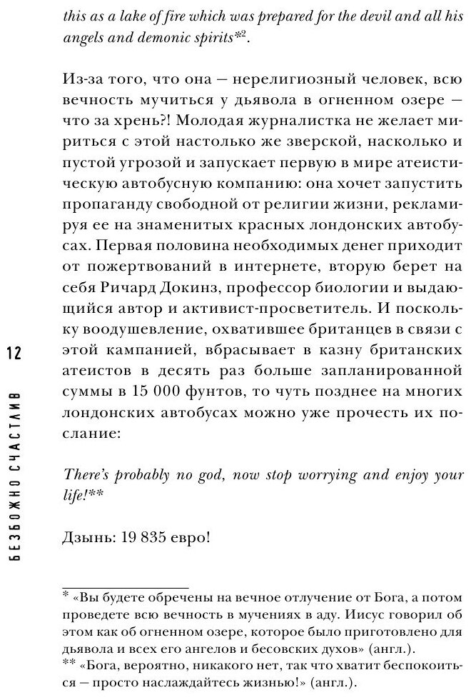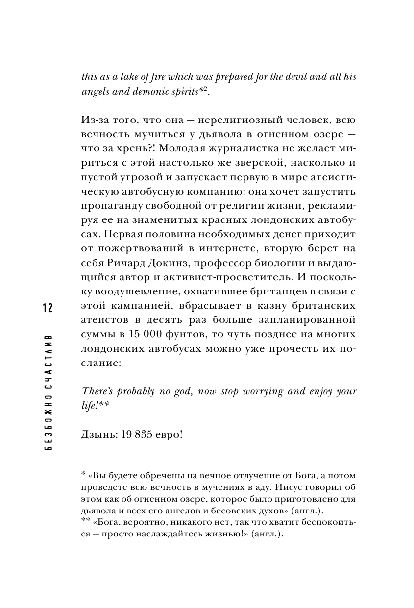Пожалуйста, оставайтесь собой, не выключайте голову, когда слышите про "ценности, нуждающиеся в Боге", доверяйте священникам не больше, чем всем остальным людям, откажитесь от уродующих тело и душу детей архаических ритуалов, из-за которых страдают невинные люди, особенно дети. - "Безбожно счастлив" обо всем этом и о многом другом. -