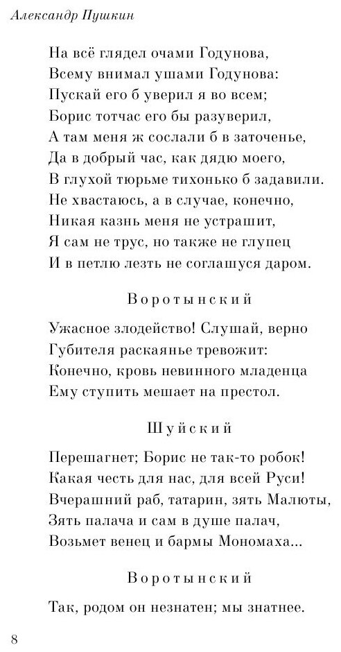 Книжка невероятно легкая, просто невесомая. Удобный формат - А6. В сборник вошли самые значимые драматические произведения, нужные для изучения в школе и внеклассного чтения, а также очень часто ставятся на сценах театров, что для школьников значимо. Прочитал - посмотрел. Очень удобно обозначено название трагедии на каждой странице сборника - не нужно заглядывать в содержание. Шрифт приятный для чтения, бумага хоть и тонкая, но не просвечивает. Всем рекомендую именно этот сборник для знакомства с драмами Пушкина.