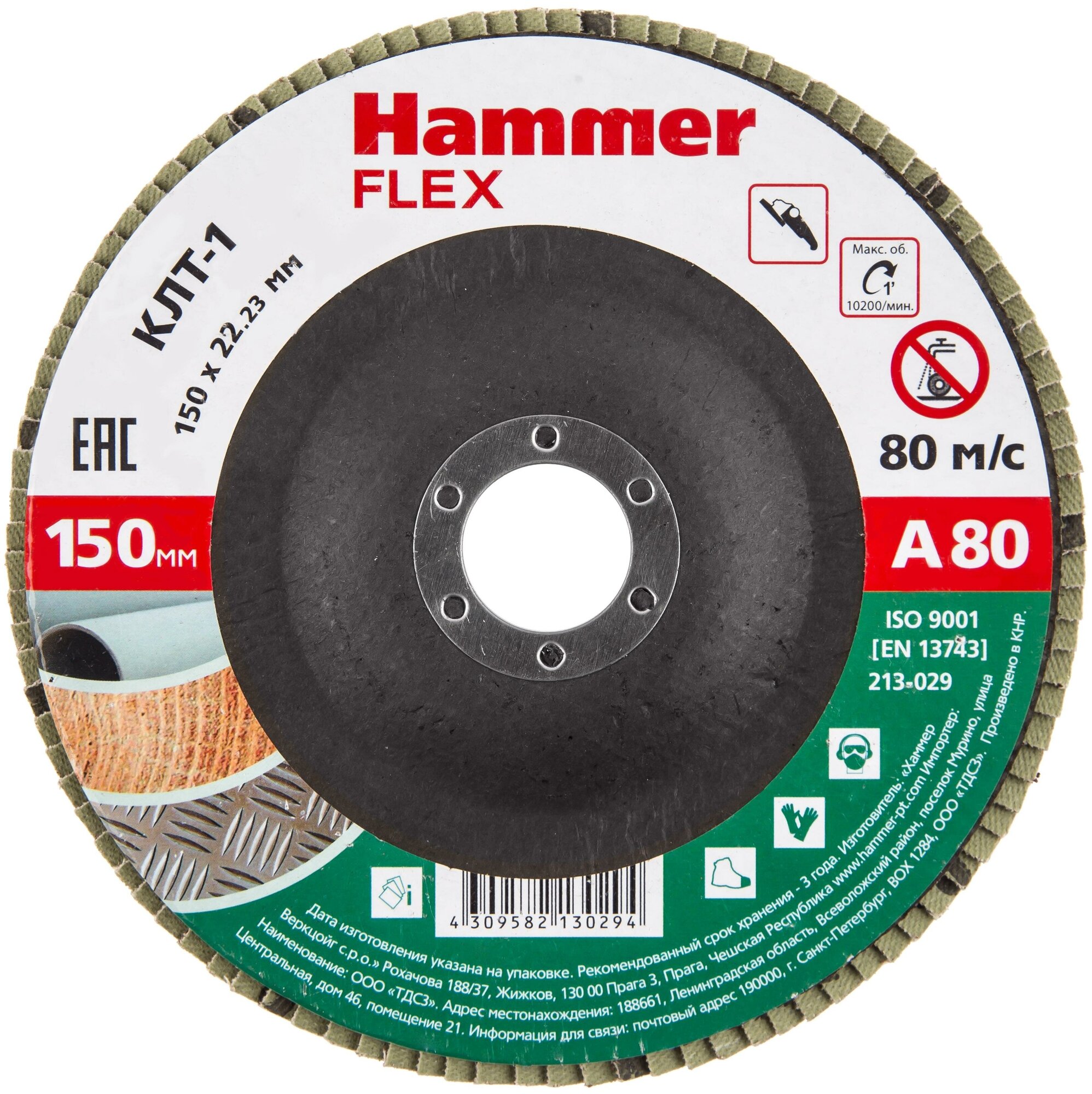 Круг лепестковый торцевой 150 Х 22 Р80 тип 1 КЛТ Hammer Flex SE В основе круга тарелка из плексигласового волокна с армирующей сеткой и шлифовальный материал на прочной тканевой основе с водостойкой пропиткой, одновременно эластичный и устойчивый к растяжению и разрыву.Шлифовальный материал состоит из искусственной смолы и абразивного зерна ''Электрокорунд'' (Al2O3), обладающего высокой твердостью и режущей способностью.Полимерное покрытие, снижает температуру в зоне обработки и усиливает шлифовальные свойства зерна.Антистатические свойства покрытия снижают забиваемость круга пылью, предотвращают засаливание абразива и увеличивают срок его службы.Круг универсален и может применяться для работ по металлу, древесине и пластику.Подходит для обработки поверхностей с разной геометрией.Предназначен для использования на УШМ(угловая шлифовальная машина)