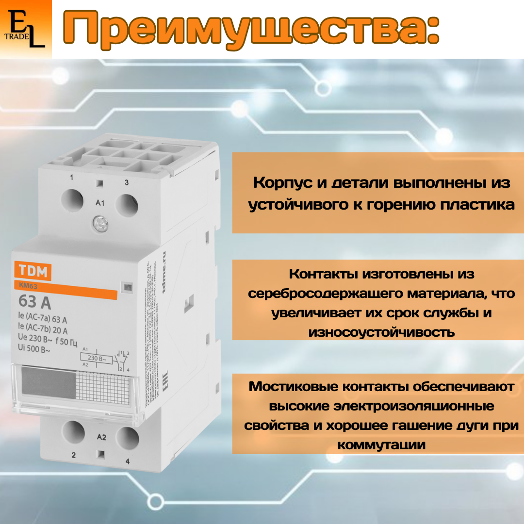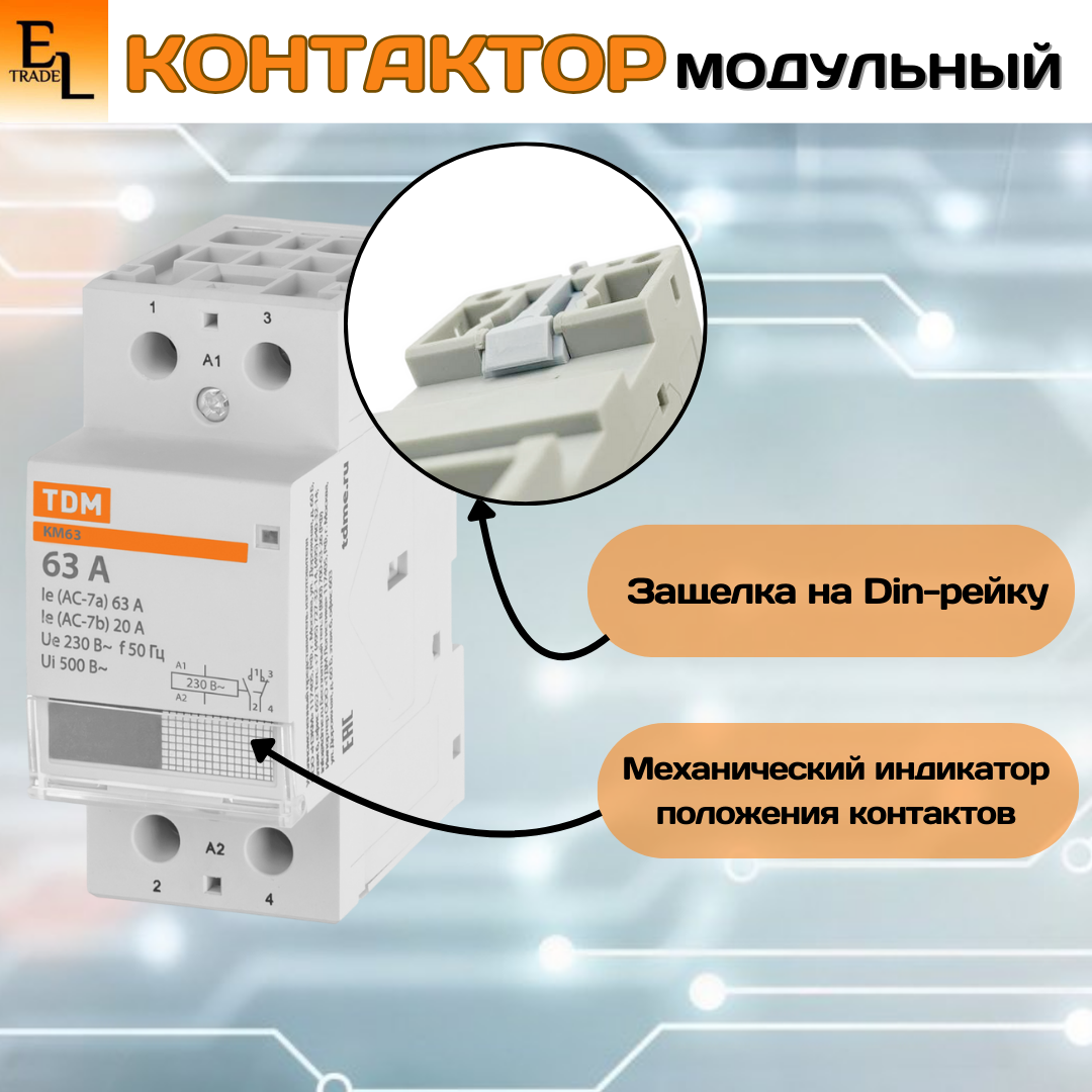 Назначение:Используются для автоматизации и управления различных технологических процессов, в том числе в системах освещения, кондиционирования, вентиляции и т. д.Применение:Автоматика инженерного оборудования: зданий, насосов, систем вентиляции, отопления, освещения и т. д.Преимущества:Защелка на DIN-рейку с фиксацией упрощает монтаж и демонтаж аппарата.На лицевой панели реализован механический индикатор положения контактов (включено/отключено),Совместимость размеров позволяет установить контактор в стандартный щиток с любыми аппаратами модульной серии.Конструкция:Мостиковые контакты обеспечивают высокие электроизоляционные свойства и хорошее гашение дуги при коммутации.Это повышает их износоустойчивость, увеличивает срок службы, уменьшает переходное сопротивление и тепловые потери.Материалы:Корпус и детали аппарата выполнены из пластика, не поддерживающего горение.