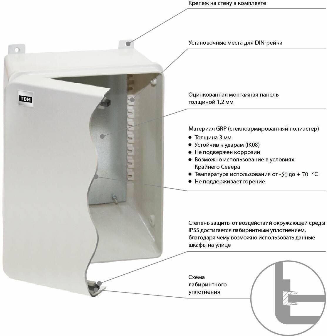 Срок службы не менее 25 лет, что в 5 раз выше, чем у металлических шкафов._x000D_Материалы:_x000D_GRP (стеклоэпоксидный армированный полиэстер)._x000D_Упаковка:_x000D_Картонная коробка со стикером и штрихкодом EAN-13.