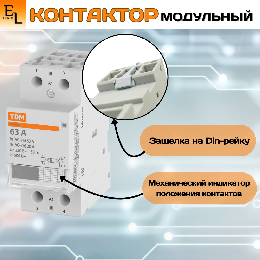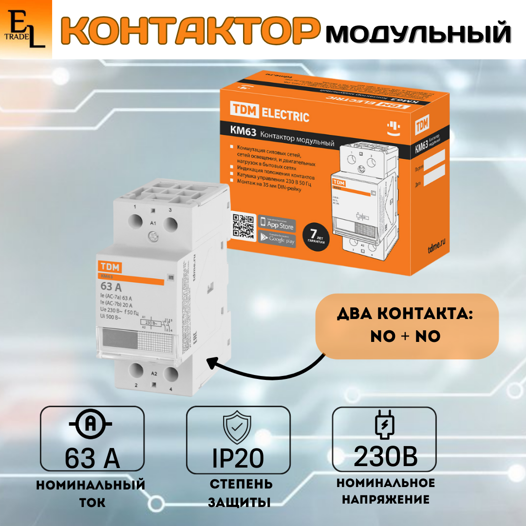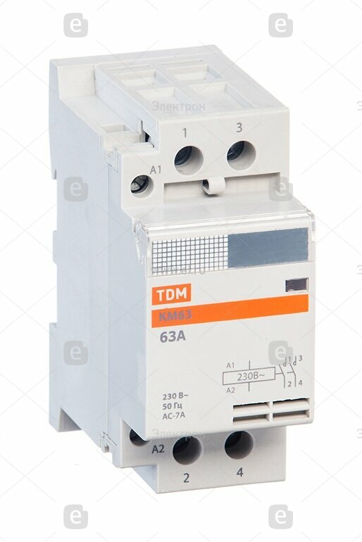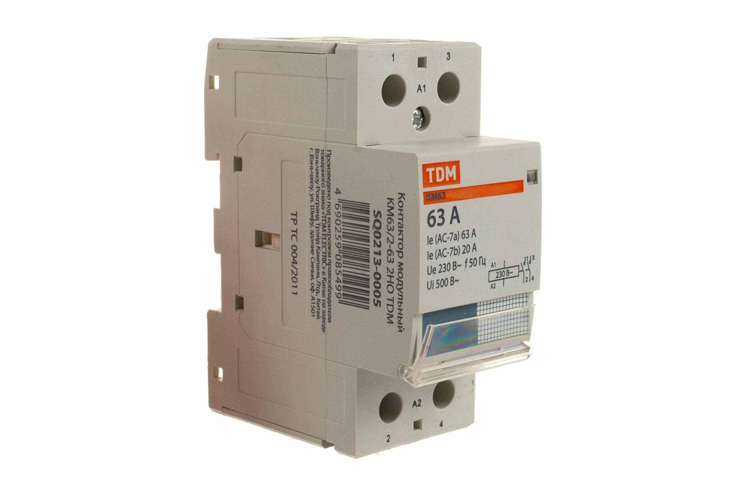 Устройство Контактор модульный КМ63/2-63А 2НО TDM 2 модуля Артикул: TDM Electric Двухполюсный модульный контактор КМ63 ТДМ, номинальный ток 63 ампера, 2 нормально-открытых контакта Назначение: Коммутация слабоиндуктивных нагрузок с номинальным током 63 А. Используются для автоматизации и управления различных технологических процессов, в том числе в системах освещения, кондиционирования, вентиляции и т. д. Применение: Автоматика инженерного оборудования: зданий, насосов, систем вентиляции, отопления, освещения и т. д. Материалы: Корпус и детали выполнены из пластика, не поддерживающего горение. Маркировка выполнена в соответствии с требованиями ГОСТ и не подвержена истиранию в пределах срока эксплуатации. Конструкция: Мостиковые контакты обеспечивают высокие электроизоляционные свойства и хорошее гашение дуги при коммутации. Контакты выполнены из серебросодержащего материала. Это повышает их износостойкость, увеличивает срок службы, уменьшает переходное сопротивление и тепловые потери. На лицевой панели выключателя контактора расположен механический индикатор положения контактов (включено/отключено). Преимущества: Самый широкий номинальный ряд в своем ценовом сегменте. Защелка на DIN-рейку с фиксацией упрощает монтаж и демонтаж аппарата. Совместимость размеров позволяет установить контактор в стандартный щиток с любыми аппаратами модульной серии.