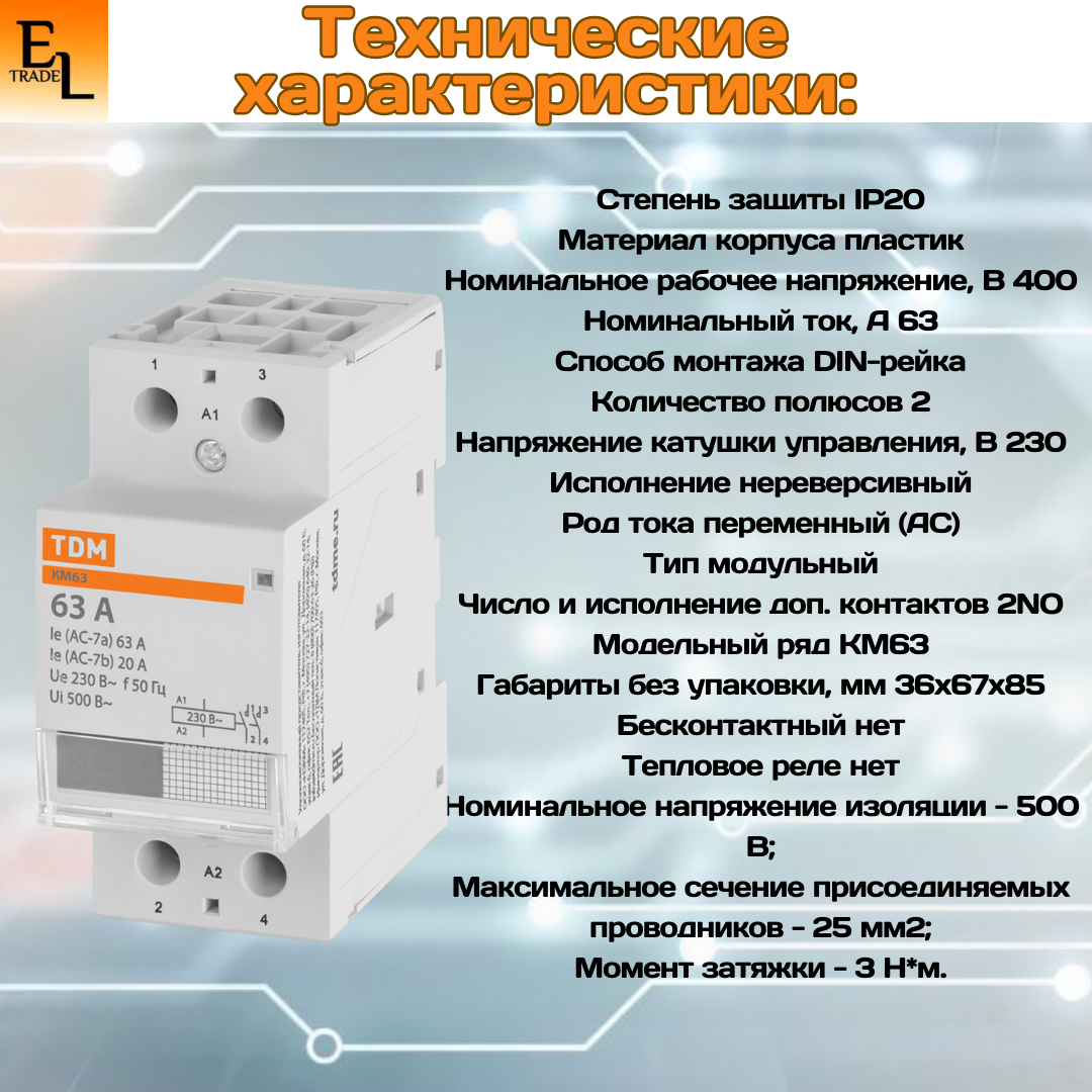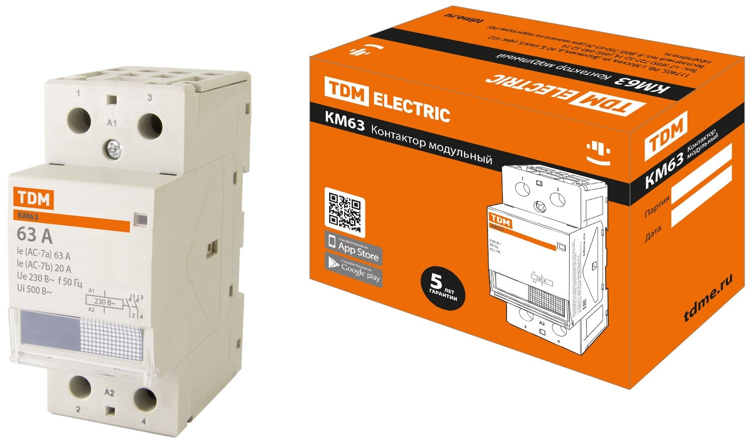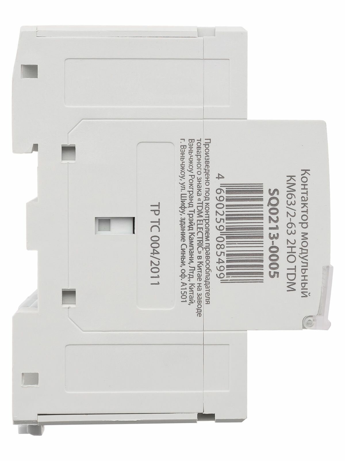 Устройство Контактор модульный КМ63/2-63А 2НО TDM 2 модуля Артикул: TDM Electric Двухполюсный модульный контактор КМ63 ТДМ, номинальный ток 63 ампера, 2 нормально-открытых контакта Назначение: Коммутация слабоиндуктивных нагрузок с номинальным током 63 А. Используются для автоматизации и управления различных технологических процессов, в том числе в системах освещения, кондиционирования, вентиляции и т. д. Применение: Автоматика инженерного оборудования: зданий, насосов, систем вентиляции, отопления, освещения и т. д. Материалы: Корпус и детали выполнены из пластика, не поддерживающего горение. Маркировка выполнена в соответствии с требованиями ГОСТ и не подвержена истиранию в пределах срока эксплуатации. Конструкция: Мостиковые контакты обеспечивают высокие электроизоляционные свойства и хорошее гашение дуги при коммутации. Контакты выполнены из серебросодержащего материала. Это повышает их износостойкость, увеличивает срок службы, уменьшает переходное сопротивление и тепловые потери. На лицевой панели выключателя контактора расположен механический индикатор положения контактов (включено/отключено). Преимущества: Самый широкий номинальный ряд в своем ценовом сегменте. Защелка на DIN-рейку с фиксацией упрощает монтаж и демонтаж аппарата. Совместимость размеров позволяет установить контактор в стандартный щиток с любыми аппаратами модульной серии.