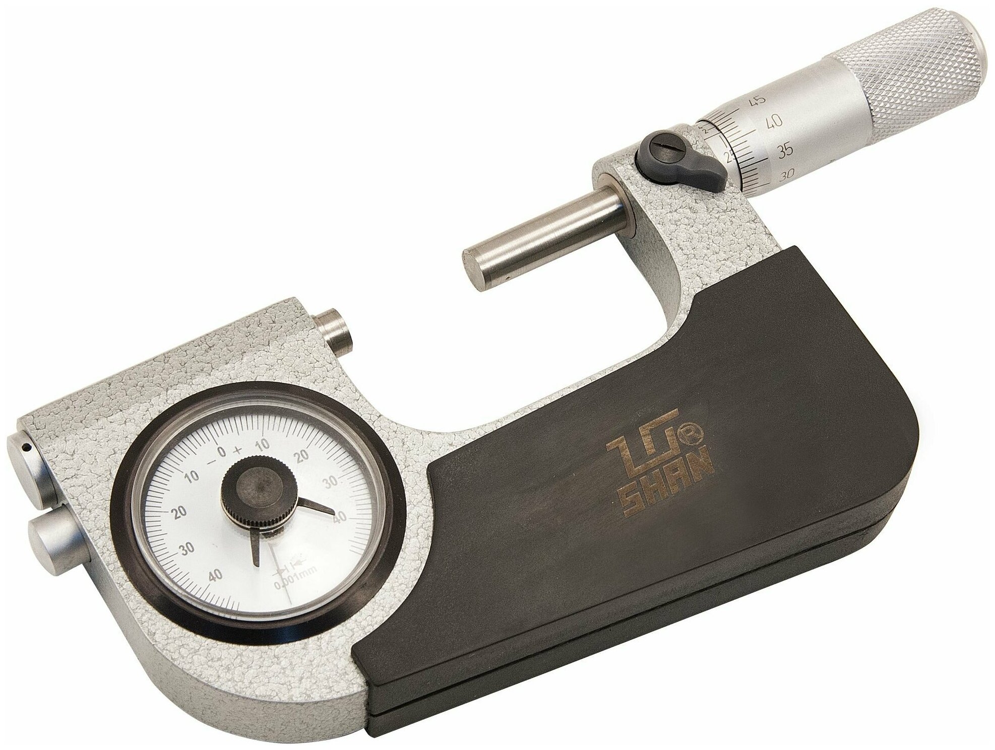 Микрометр рычажный МР- 50 0.001 SHAN- измерительный прибор, использующийся преимущественно для относительных измерений и контроля отклонений от заданных размеров деталей и высверливаемых отверстий. По сравнению со стандартным гладким микрометром МК и МКЦ, конструкция рычажного микрометра (МР, МРИ), имеет две подвижные пятки для измерения. Одна из них соединяется с отчетным устройством, встроенным в корпус при помощи рычажного механизма, другая расположена с торца микрометрического винта. Рычажные микрометры не подходят для стандартных способов использования для получения абсолютных измерений, являясь узкоспециализированным устройством. Ввиду наличия часового механизма, с рычажным микрометром необходимо обращаться предельно аккуратно. Не допускайте падения микрометра, избегайте сильных встрясок и любых других механических повреждений прибора.