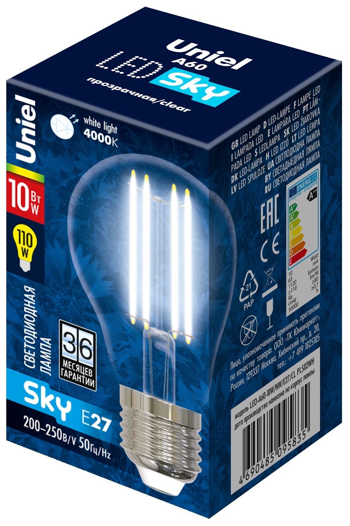 Лампа светодиодная филаментная PLS02WH из серии «SKY» от производителя Uniel (Китай). Цвет товара серый. Используемые материалы: металл. С учетом технических характеристик мощности хватит для освещения 5 м2. Цоколь E27. Вид ламп: светодиодная. Изделие выполнено в форме «груша». Мощность одной лампы составляет 10 Вт. Напряжение 220-240 Вольт. Поток света 920 Люмен. Заявленный производителем срок работы 30000 часов. Расширенная гарантия на товар 2,5 года. Высота 110 мм. Диаметр 60 мм. Вес товара 0.07 кг. Комплектация: Лампа светодиодная филаментная. Инструкция по сборке/использованию. Детали, необходимые для сборки товара.Товар упакован в картонную коробку. В случае доставки транспортными службами или маркетплейсом добавляются дополнительные элементы упаковки для защиты от повреждений при транспортировке - усиление картоном, внутренний наполнитель, стрейч-пленка.