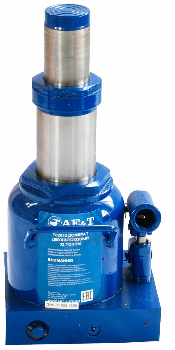 Домкрат бутылочный двухштоковый T02012 AE&T предназначен для подъема автомобилей до 32 тонн при проведении диагностических и ремонтных работ. Особенности: Компактное устройство; Простая эксплуатация; Наличие предохранительного клапана; Наличие телескопического штока позволяет поднимать груз выше обычных домкратов. Технические характеристики: Грузоподъемность: 32 тонны. Высота подъема min/max: 235/415 мм. Вес нетто/брутто: 17/18 кг. Упаковка: 220*180*250 мм.