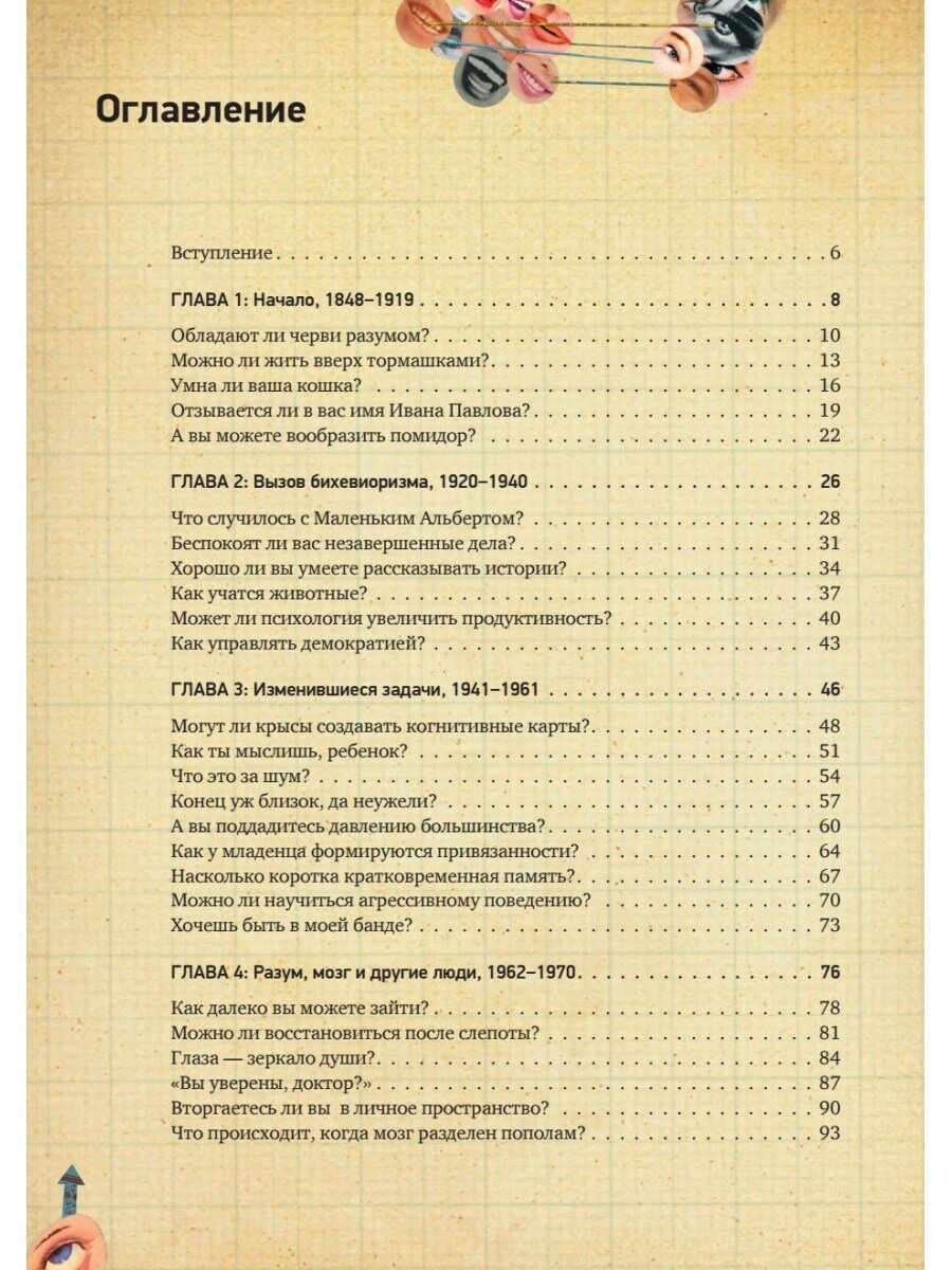 Боялась, что в книге будет много и без того известных экспериментов, о которых часто говорят, но сразу скажу, что зря боялась. Например, про эксперимент Милгрэма ("Как далеко вы можете зайти?") я слышала не раз. Но не знала, что позже были и другие подобные эксперименты, исследующие эту область более подробно. Не обошлось и без собаки Павлова, но и эта глава была необходима, как основа для рассказа о другом эксперименте. Исследования представлены в хронологическом порядке и разбиты на "эпохи". Добавлю оглавление, чтобы можно было составить представление о книге. Мне понравилось, очень рекомендую. Читается легко и быстро. В конце представлен достаточно солидный список используемой литературы. Также есть небольшой глоссарий.