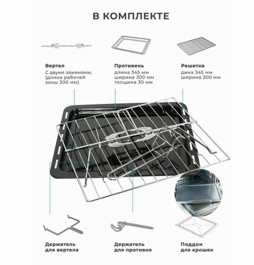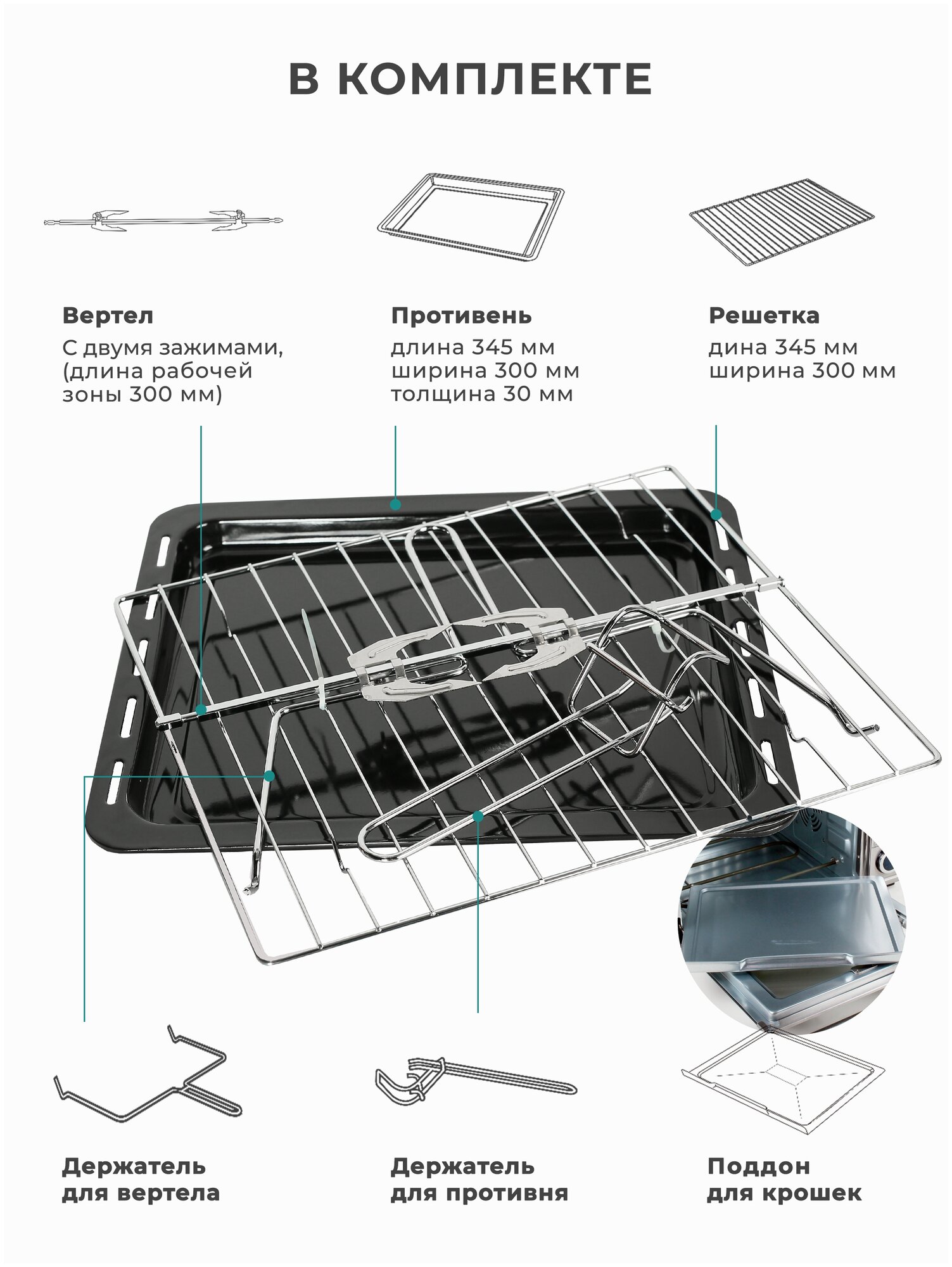 | Прочее | вертел, решётка, противень, поддон для сбора крошек, держатель для противня/решётки |