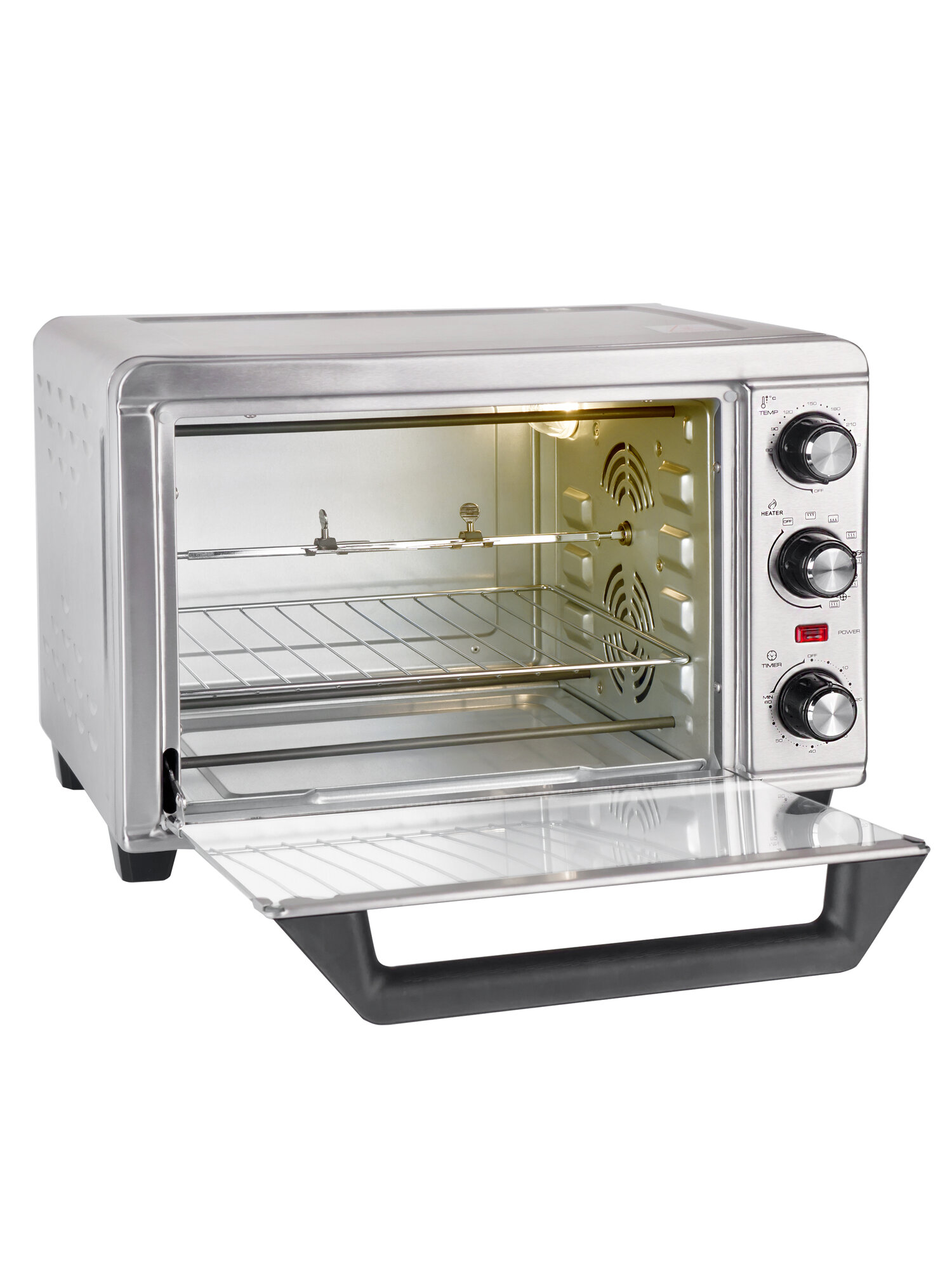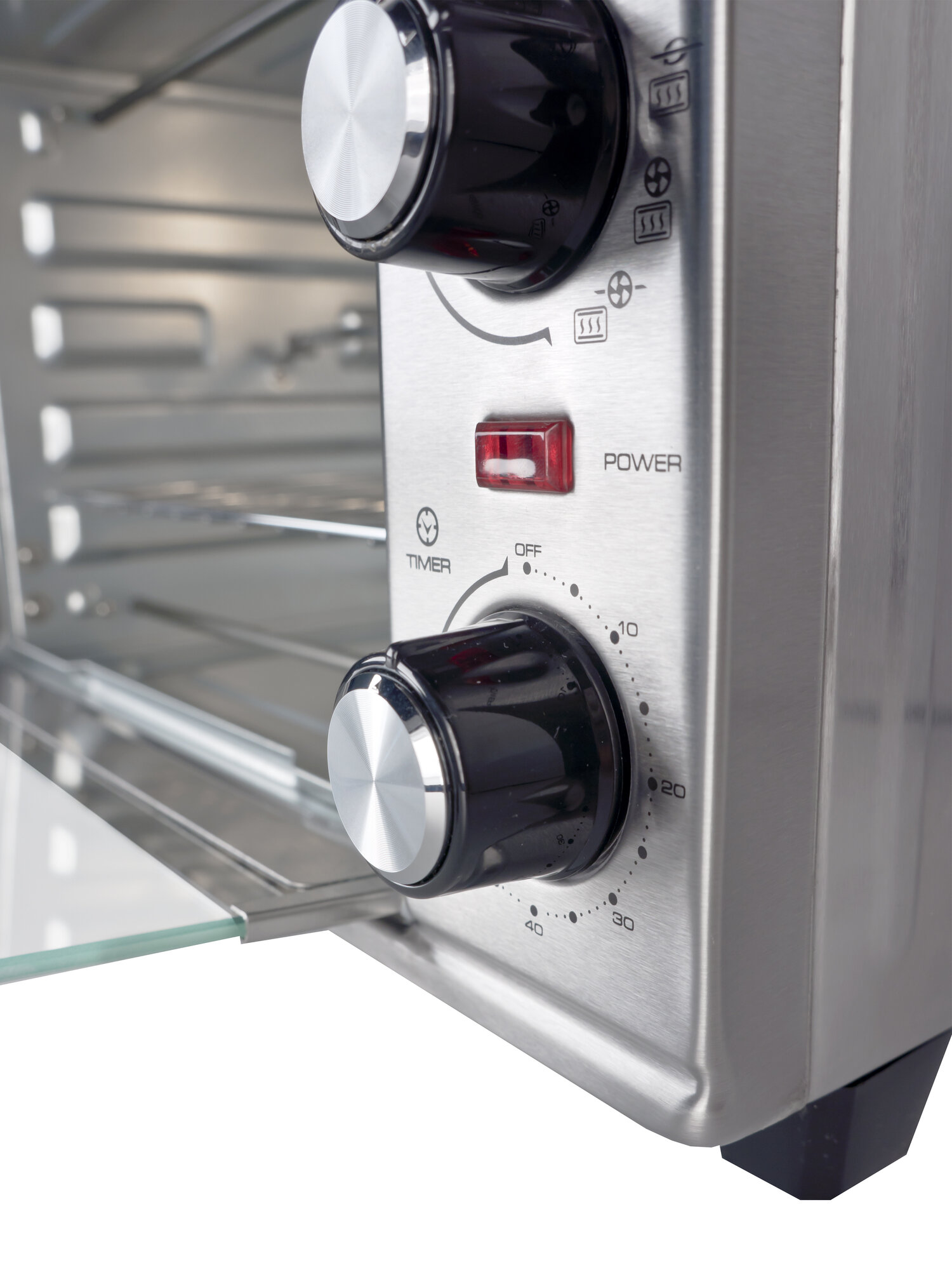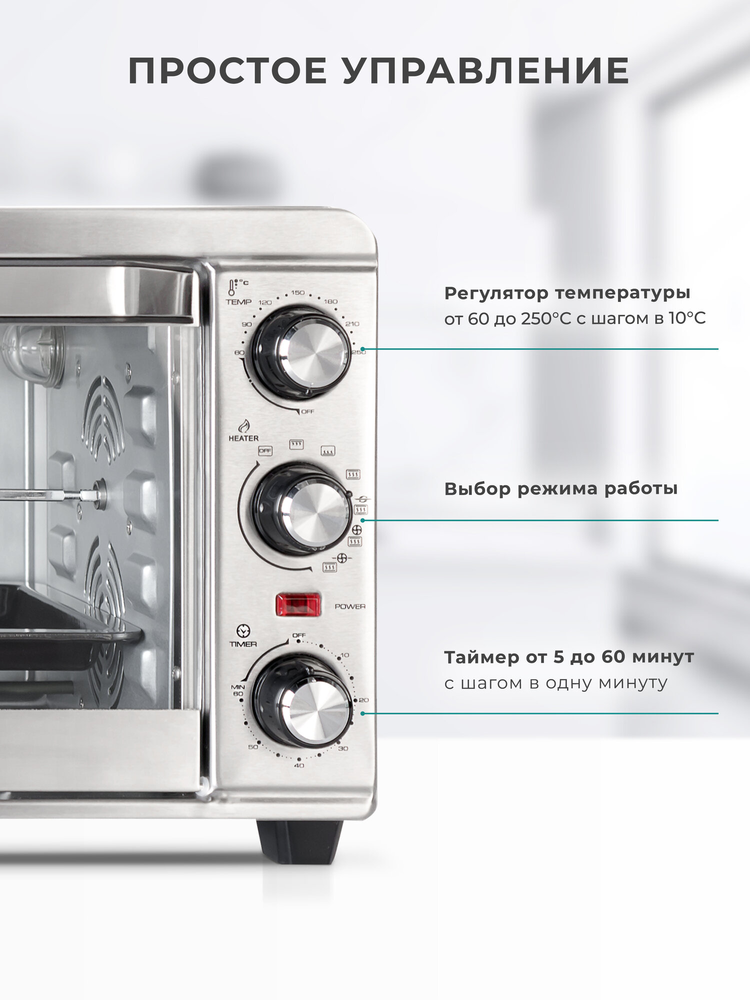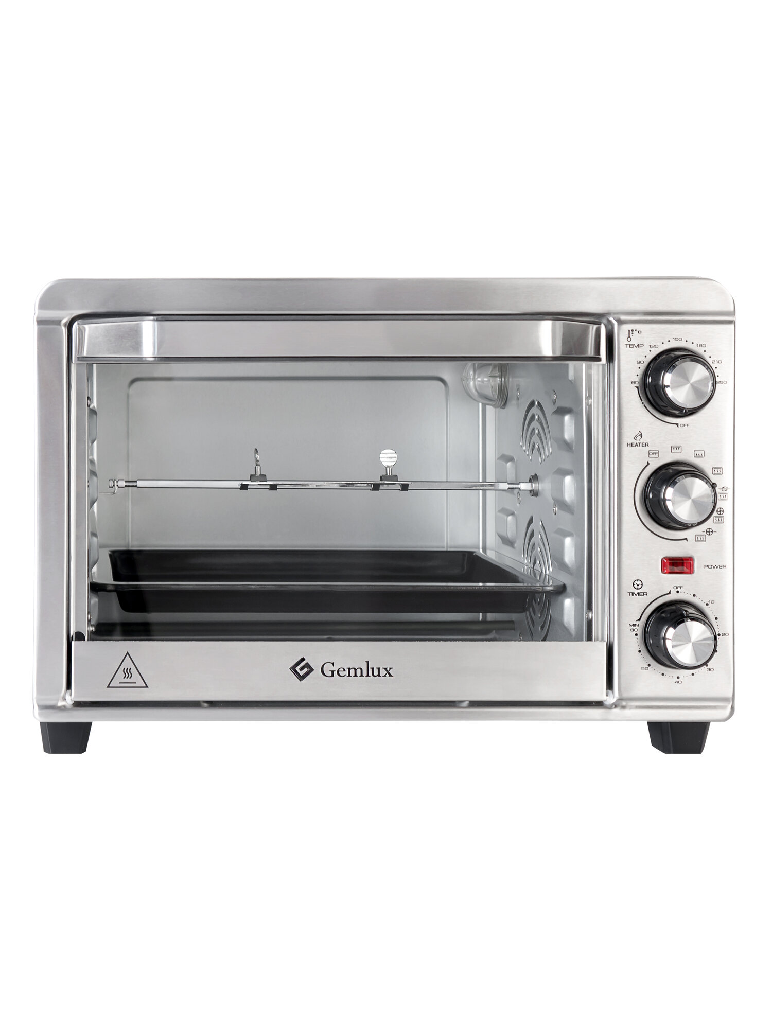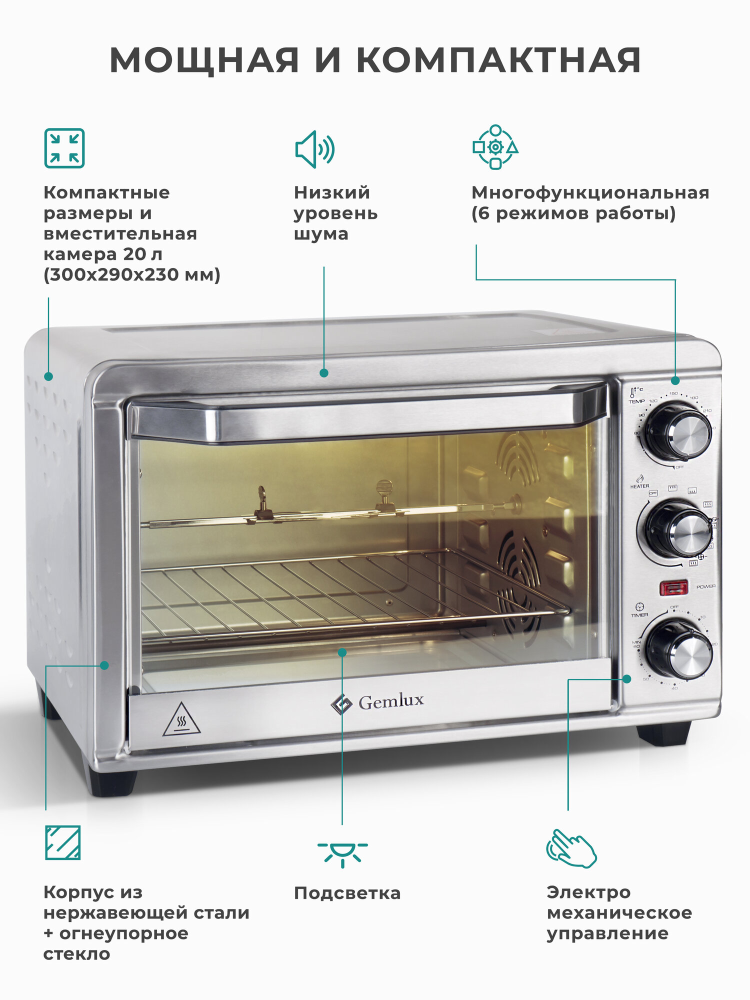 Техника для дома Gemlux Компактная конвекционная печь GEMLUX с объемом рабочей камеры 20 л идеально подойдет в качестве полноценной замены электрической духовке в условиях ограниченного пространства: на малогабаритной городской кухне, в небольшом дачном доме и т.д. Модель имеет прочный и гигиеничный корпус из нержавеющей стали и простое электромеханическое управление. Вращением ручек, расположенных на передней панели устройства справа от дверцы, вы можете задавать любое сочетание опций для того или иного рецепта: режим работы (верхний нагрев, нижний нагрев, верхний и нижний нагрев, верхний и нижний нагрев + вращение вертела, верхний и нижний нагрев + конвекция, верхний и нижний нагрев + конвекция + вращение вертела); температуру нагревательных элементов (60°С - 250°С); время приготовления (0-60 минут). Камера печи достаточно вместительна: в ней можно приготовить небольшого цыпленка-гриль на вертеле, мясо и овощи в форме для запекания, хлеб, пиццу, тосты и многое другое. Конвекция значительно ускоряет процесс жарки и выпечки и делает его более равномерным, а выдвижной поддон для крошек упрощает очистку.