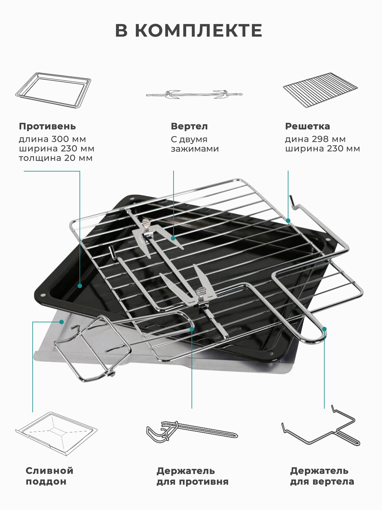 | Комплектация | держатель для противня/решётки, вертел, противень, решётка, поддон для сбора крошек |