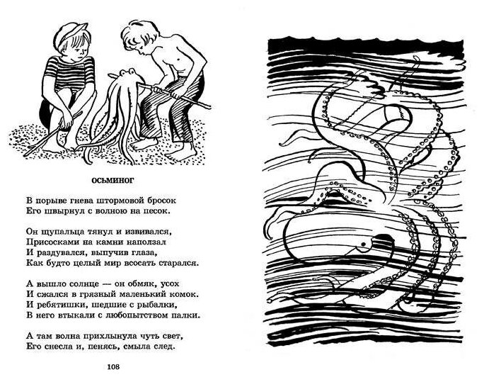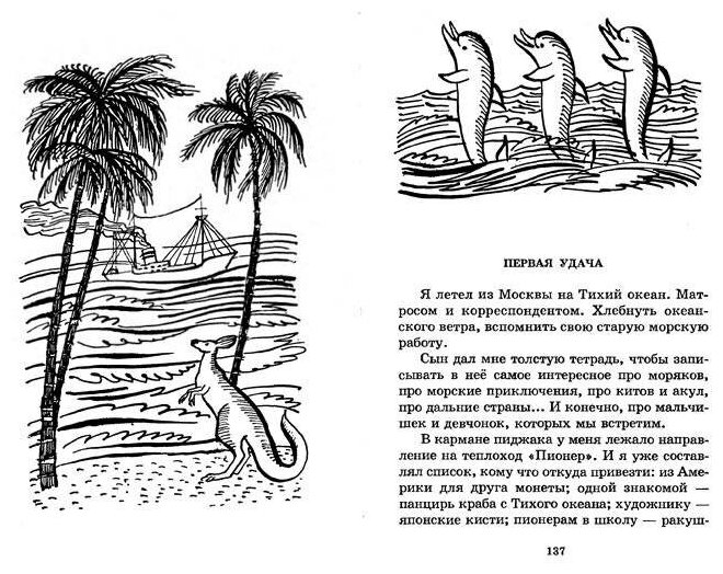 Хорошая книга. В первой части книги рассказы перемежаются со стихотворениями, а вторая часть - это повесть "Волны словно кенгуру". Пока мы ее читали, мой 6-летний сын каждый вечер расставался с ней с трудом - почитай да почитай еще, а стихотворение "Два дымка" его так тронуло, что он по собственной инициативе тут же выучил егонаизусть. Морская тематика интересна мальчишкам сама по себе, но книга не просто о море, моряках и о морских обитателях, но в первую очередь о том, как по-разному ведут себя люди - взрослые и дети, те же мальчишки - в разных (а в море часто бывает, что в трудных) ситуациях, о смелости и щедрости, о доброте и умении поддержать новичка, а еще - об отношении к окружающему миру, ко всему живому. Иллюстрации нам показались вполне подходящими, неплохими. Думаю, что для самостоятельного чтения книга подходит детям лет с 12, а вот послушать можно гораздо раньше, но потребуются объяснения.