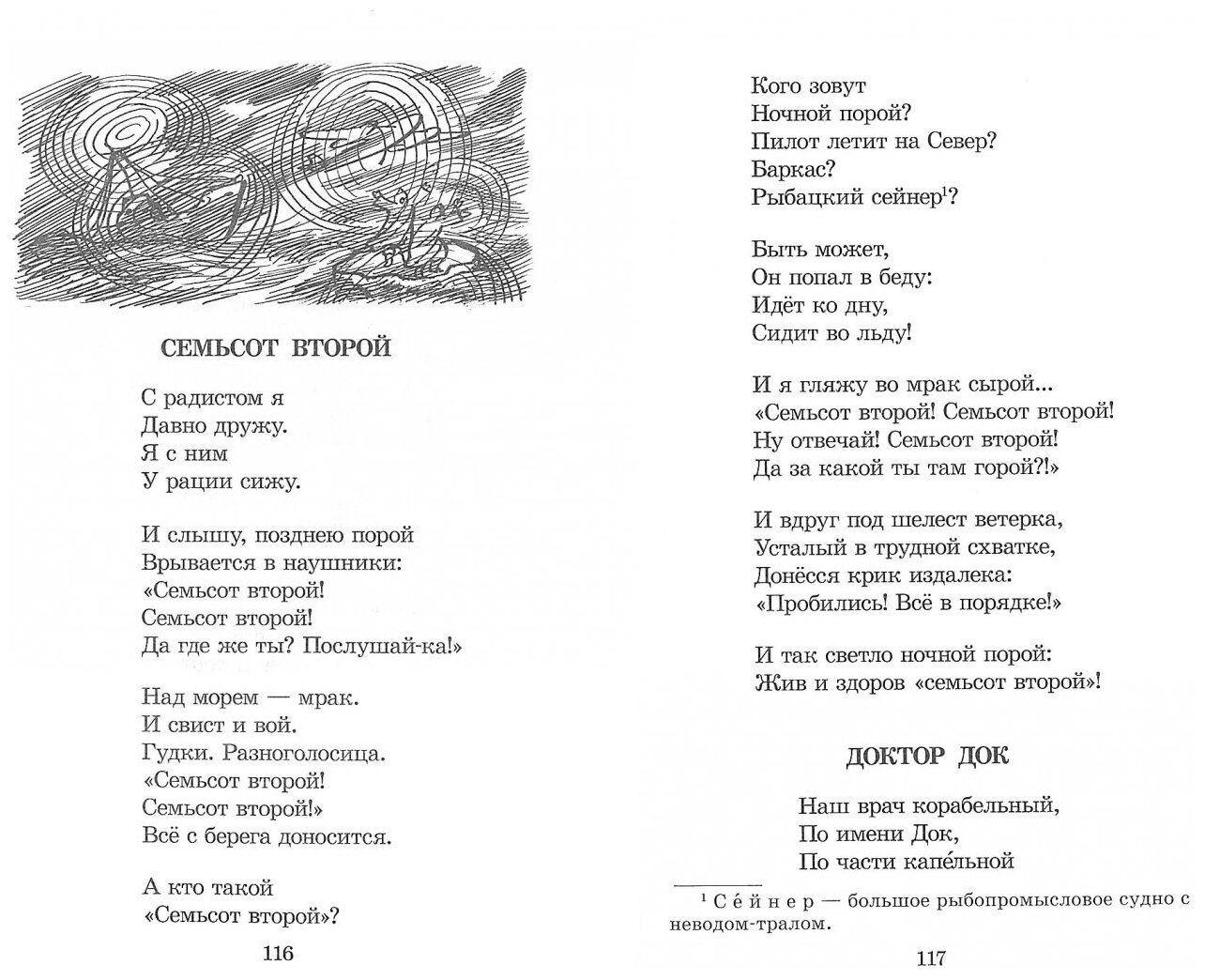 шрифт средний, текст с противоположной стороны немного просвечивает, иллюстрации ч/б не на каждой странице, к стихам иллюстраций много, а к рассказам почти совсем нет. Иллюстрации мне не понравились (даже дельфин злой получился). Книга подойдет для чтения только школьникам и, скорей всего, только мальчикам. Я книгу не читала, но дети всю ее не стали читать, сказали не интересно, прочитали несколько рассказов по школьной программе