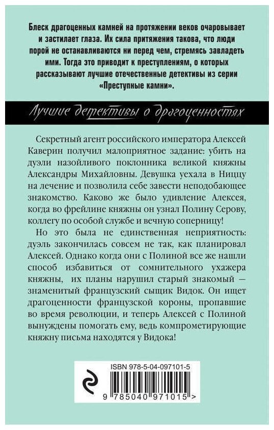 Секретный агент российского императора Алексей Каверин получил малоприятное задание: убить на дуэли назойливого поклонника великой княжны Александры Михайловны. Девушка уехала в Ниццу на лечение и позволила себе завести неподобающее знакомство. Каково же было удивление Алексея, когда во фрейлине княжны он узнал Полину Серову, коллегу по особой службе и вечную соперницу! Но это была не единственная неприятность: дуэль закончилась совсем не так, как планировал Алексей. Однако когда они с Полиной все же нашли способ избавиться от сомнительного ухажера княжны, их планы нарушил старый знакомый - знаменитый французский сыщик Видок. Он ищет драгоценности французской короны, пропавшие во время революции, и теперь Алексей с Полиной вынуждены помогать ему, ведь компрометирующие княжну письма находятся у Видока!