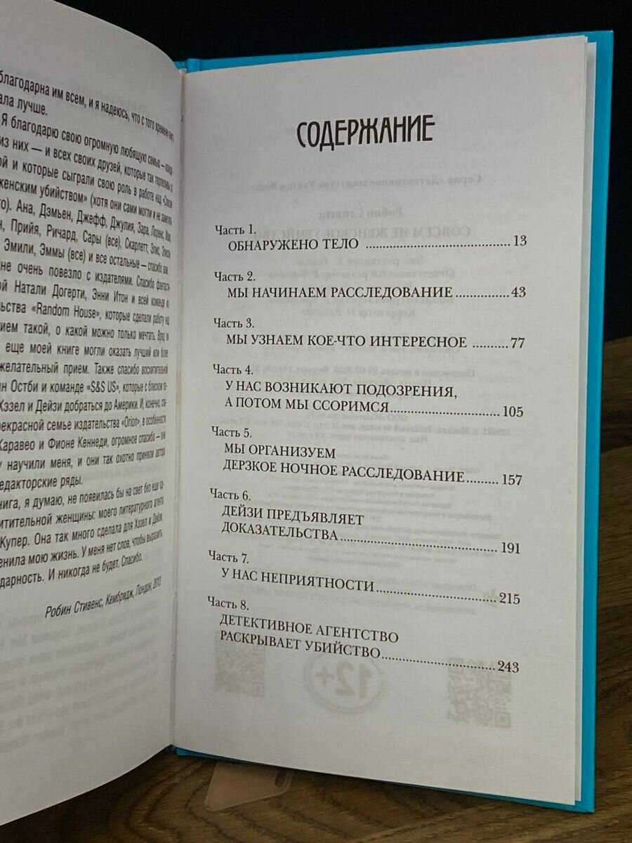Обложка красивая и стильная, хочется поставить на полку и носить всегда с собой. Внутри хорошая, белая бумага. Страниц где-то 317-320. Книжка затягивает не полностью, но хочется узнать, кто совершил убийство. Только это и толкало меня продолжать читать историю о двух восьмиклассницах и двух мёртвых учительницах. Повествование идёт от скромной, пухленькой подруги популярной школьницы. Они создают агентство, состоящее только из них и пытаются раскрыть убийцу. Отдельный комментарий про конец книги: это круто. Было безумно интересно читать, как девочки нашли виновника преступления и успели вляпаться в новую передрягу.