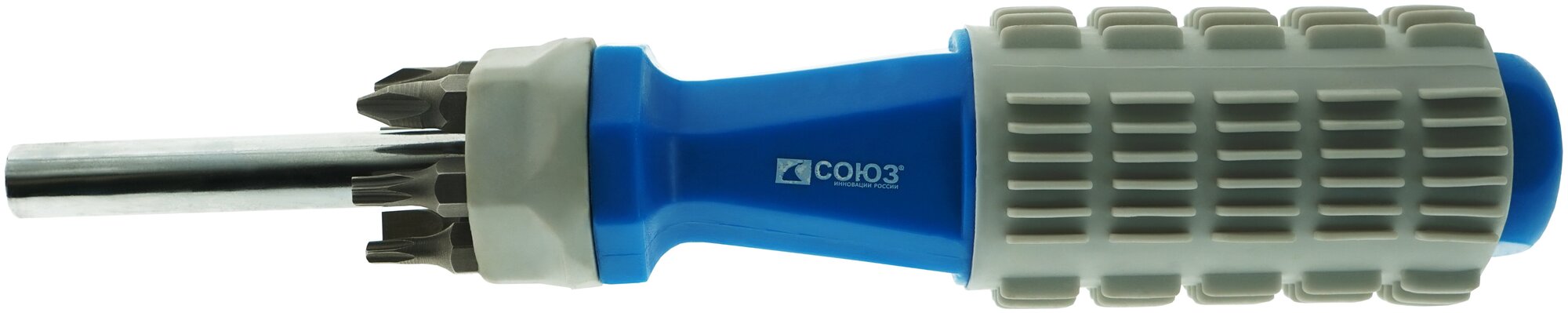 Отвертка-перевертыш производства Союз - это универсальный инструмент, применяющийся при широком спектре ремонтных работ, для сборки мебели, затяжки винтов, а также для незначительных дел в домашнем обиходе. Без такого базового инструмента, как отвертка, не обходится ни одна мастерская. Данный комплект применяется для работ с различными крепежными элементами . Магнитные наконечники позволят зафиксировать насадку нужной стороной за считанные секунды.