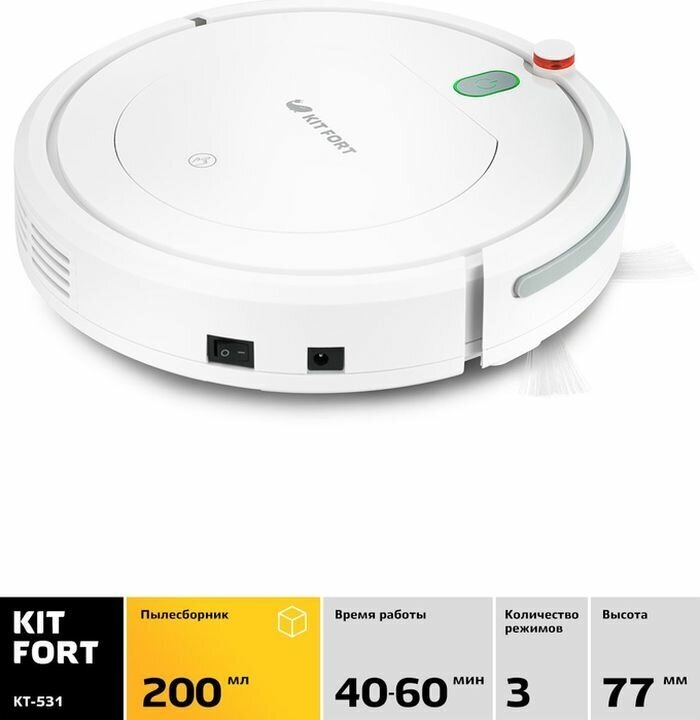 Робот-пылесос Kitfort КТ-531 - это современное поколение роботизированных пылесосов без турбощетки. Он оснащен двумя боковыми щетками, что увеличивает скорость и качество уборки. Ворс боковых щеток выступает за габариты пылесоса, что позволяет ему собирать пыль вдоль плинтусов и диванов, около дверных косяков и других подобных объектов.