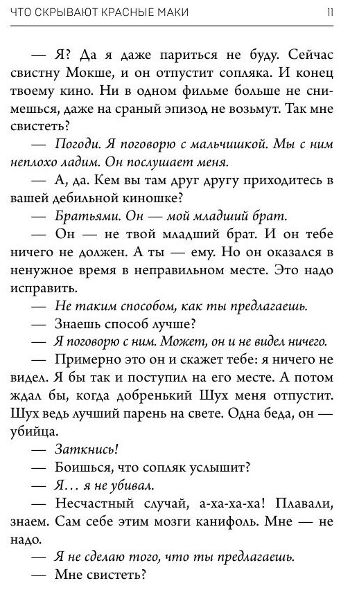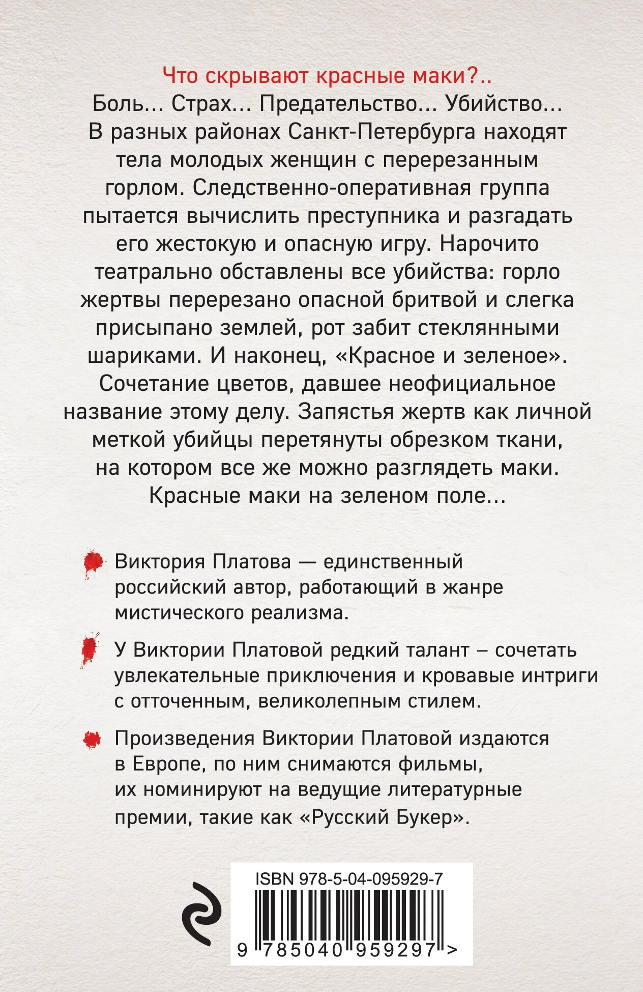 Что скрывают красные маки?.. Боль… Страх… Предательство… Убийство… В разных районах Санкт-Петербурга находят тела молодых женщин с перерезанным горлом. Следственно-оперативная группа пытается вычислить преступника и разгадать его жестокую и опасную игру. Нарочито театрально обставлены все убийства: горло жертвы перерезано опасной бритвой и слегка присыпано землей, рот забит стеклянными шариками. И, наконец, "Красное и зеленое". Сочетание цветов, давшее неофициальное название этому делу. Запястья жертв как личной меткой убийцы перетянуты обрезком ткани, на котором все же можно разглядеть маки. Красные маки на зеленом поле…