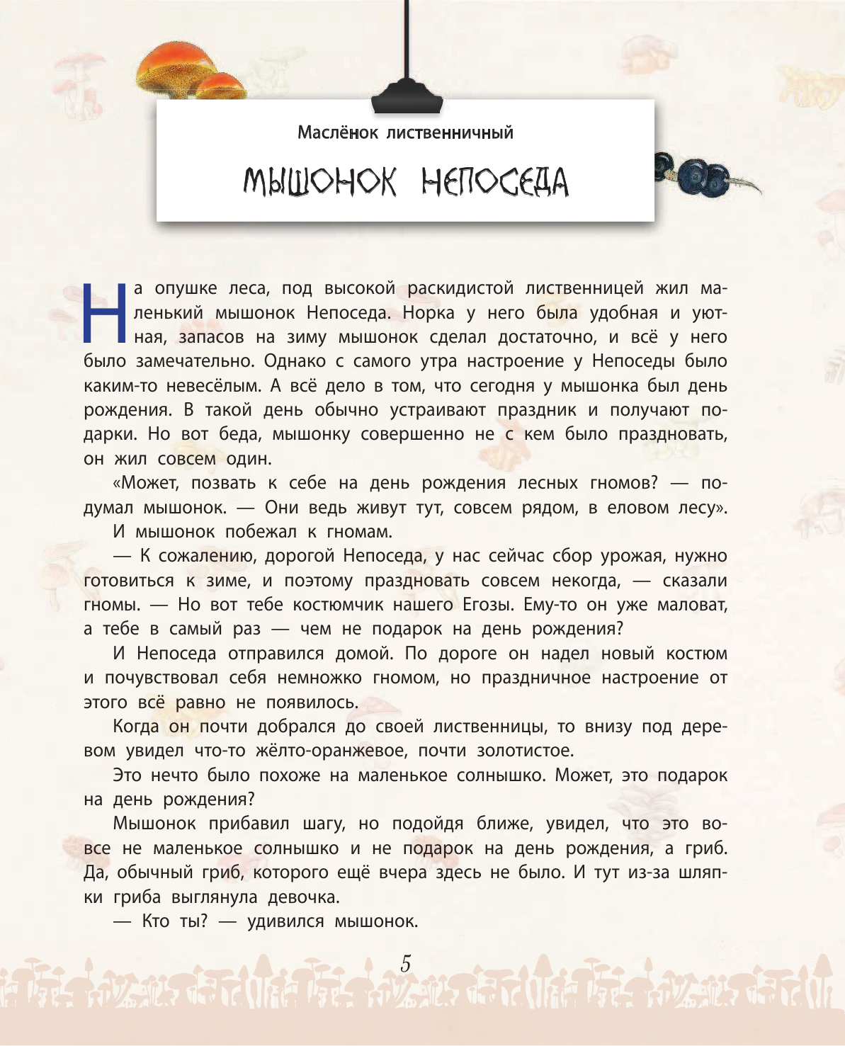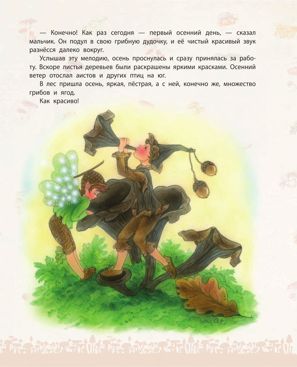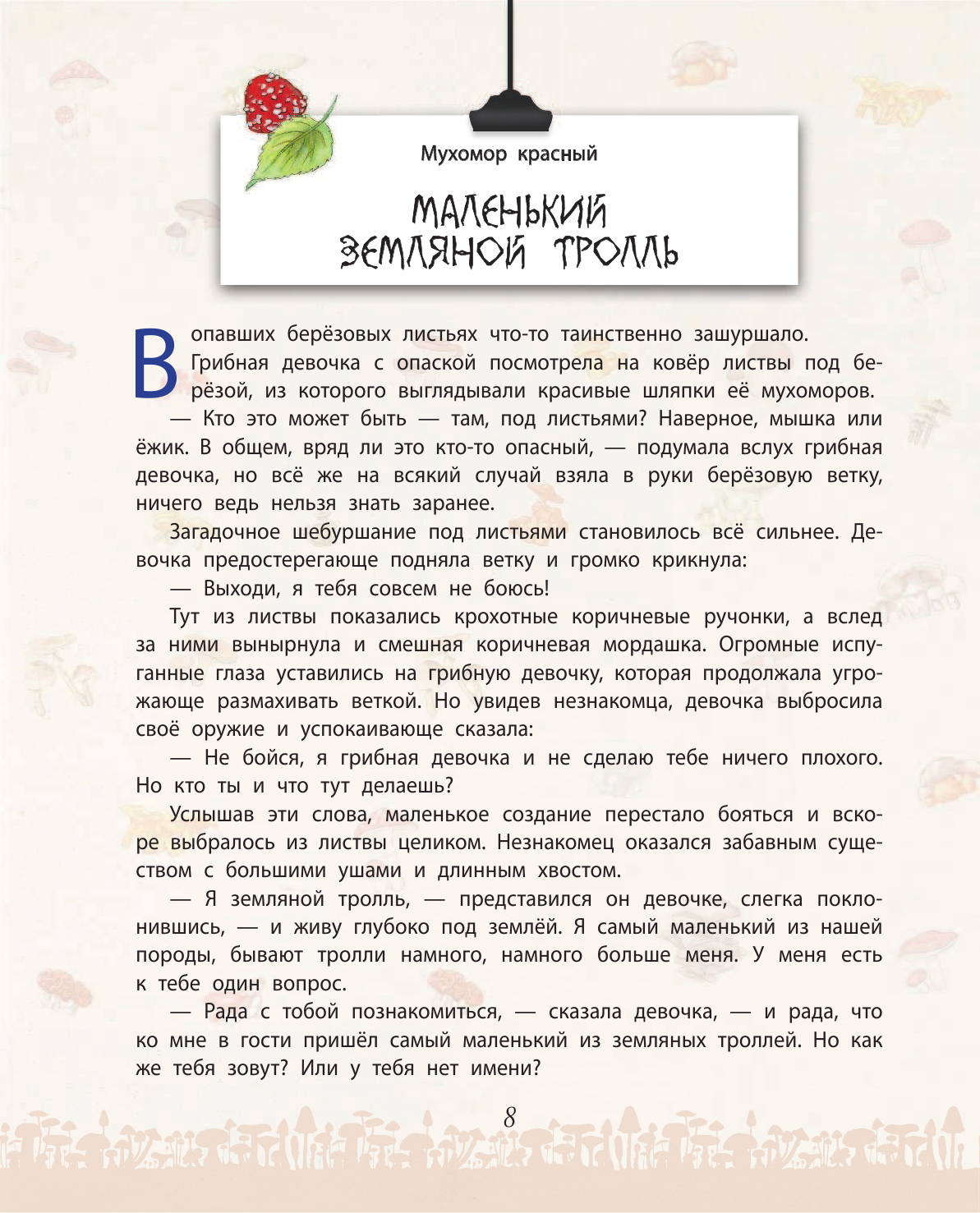 Это сборник маленьких рассказов на 1-2 странички. Каждый рассказ - небольшая история про грибных человечков и прочих сказочных лесных жителей, с изумительно нарисованной иллюстрацией героев. При этом они не связаны друг с другом и можно читать в хаотичном порядке. Слог простой и приятный, не примитивный и не вычурный.