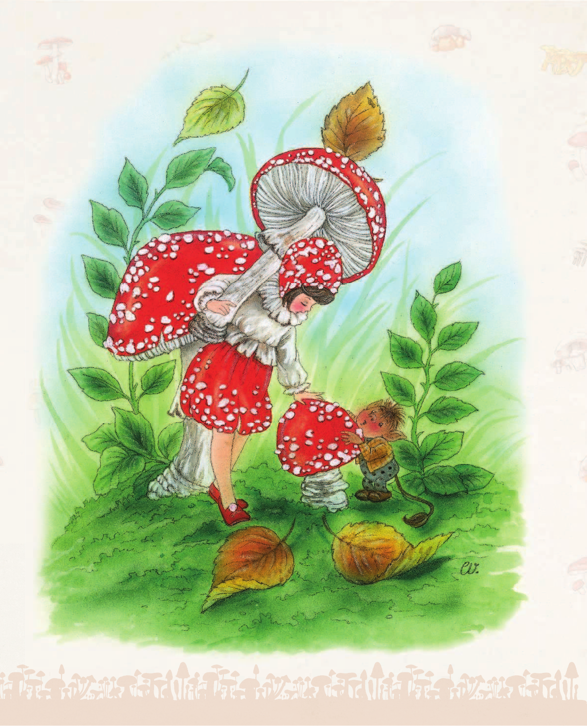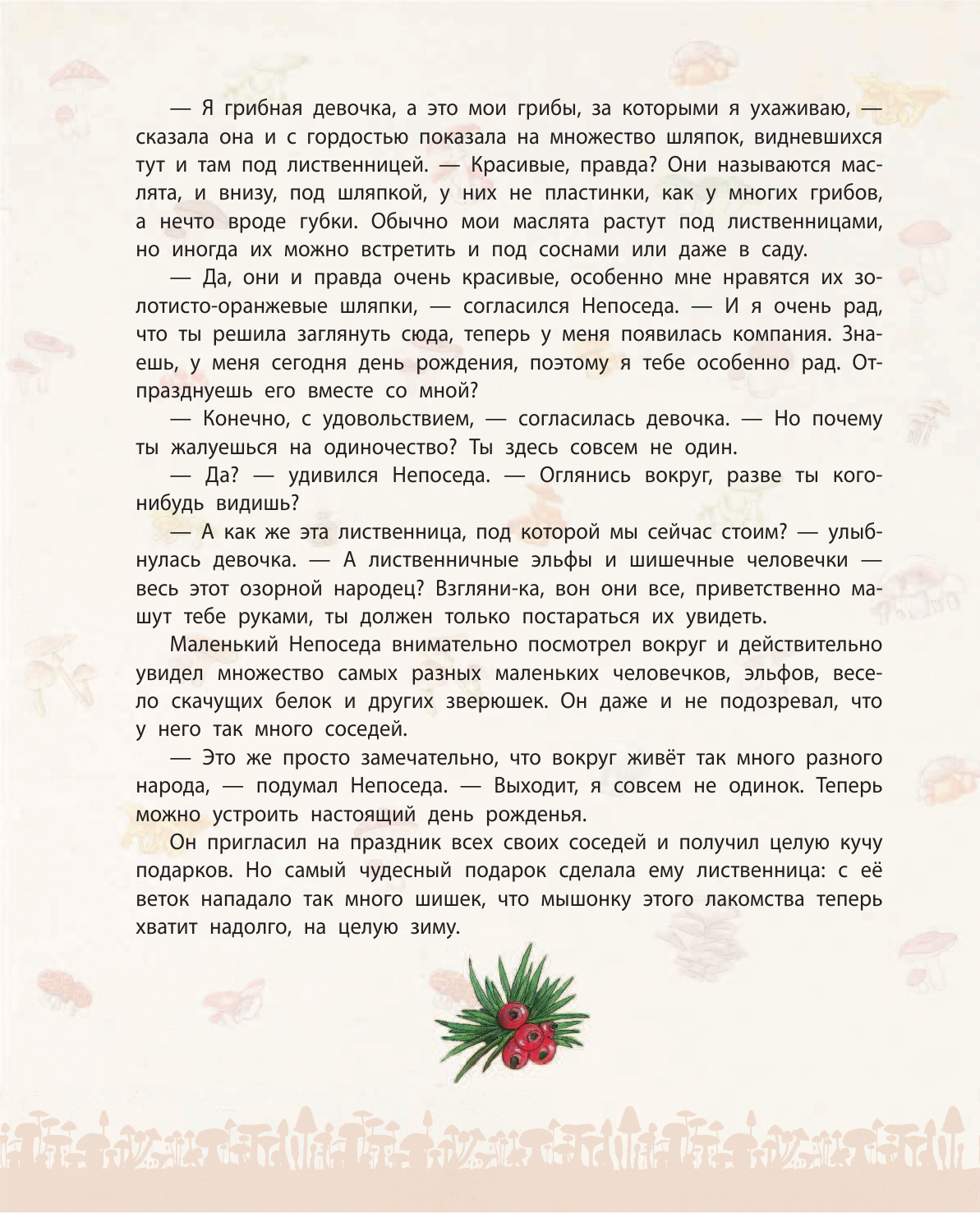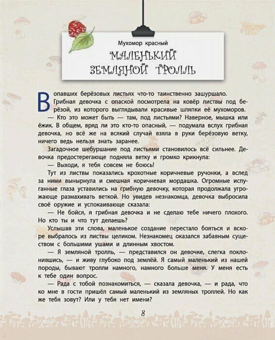 Это сборник маленьких рассказов на 1-2 странички. Каждый рассказ - небольшая история про грибных человечков и прочих сказочных лесных жителей, с изумительно нарисованной иллюстрацией героев. При этом они не связаны друг с другом и можно читать в хаотичном порядке. Слог простой и приятный, не примитивный и не вычурный.