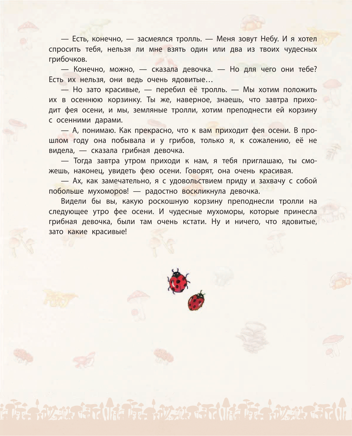 Это уже вторая книга из серии, купила её в подарок племяшке 4 лет. Книга очень красивая, яркая зеленоватая обложка с мерцающими звездочками, плотные глянцевые листы с хорошим шрифтом. Изюминка книги - потрясающие иллюстрации, которые идут к каждой небольшой истории (всего их 61). На картинках изображены всевозможные грибы, сказочные лесные человечки и насекомые. Истории маленькие, не связанные между собой, на возраст 2+.