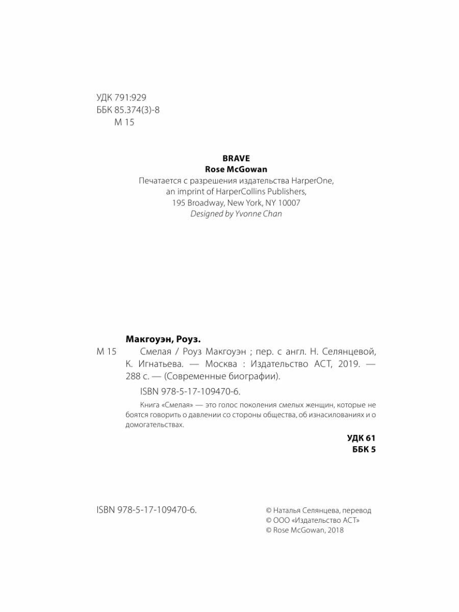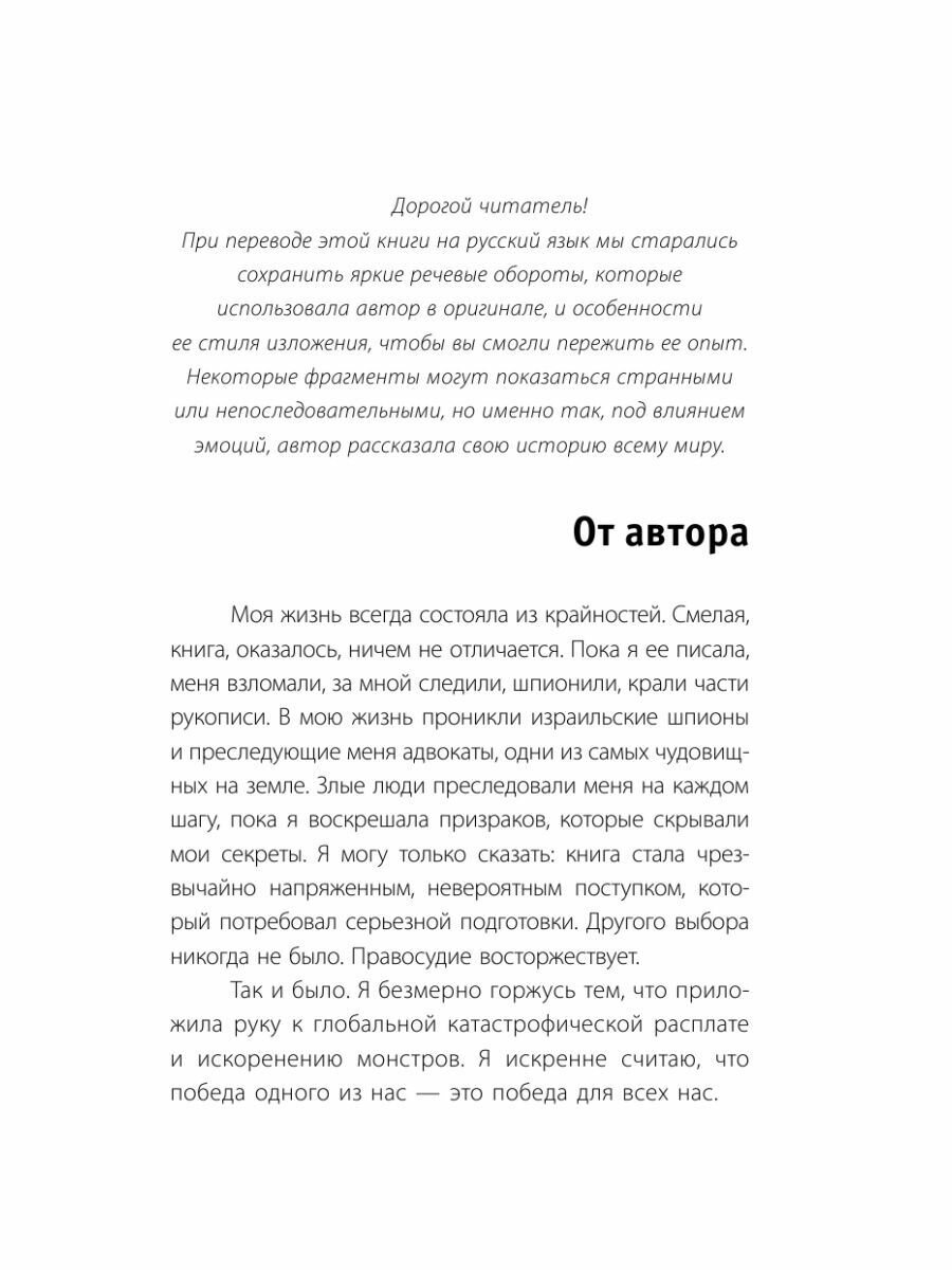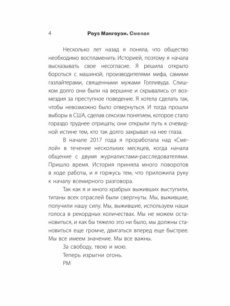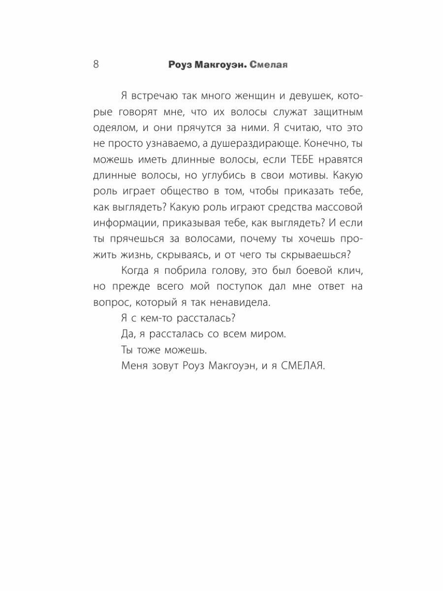 "Жизнь, как ты узнаешь из книги, бросала меня из одного культа в другой. В своей жизни, как ты узнаешь из книги, я попадала под влияние то одного культа, то другого. "Смелая" - это история о том, как я боролась с этими культами и смогла вернуть себе жизнь. Я хочу помочь тебе сделать то же самое". Роуз Макгоуэн